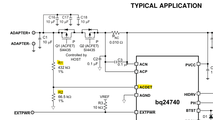adapter input to ACDET pin to AGND pin. Adapter voltage is detected if ACDET-pin voltage is greater than 2.4 V