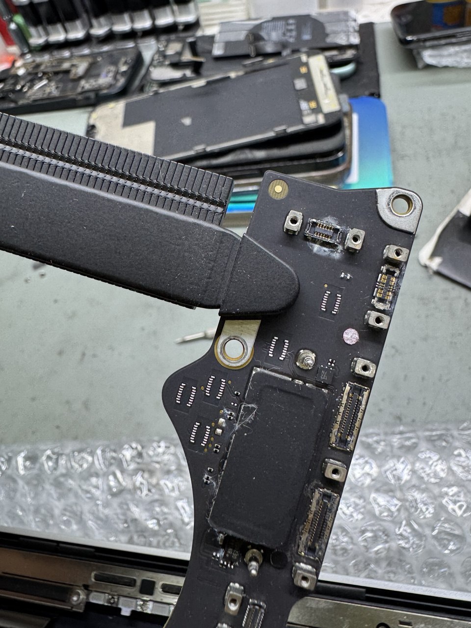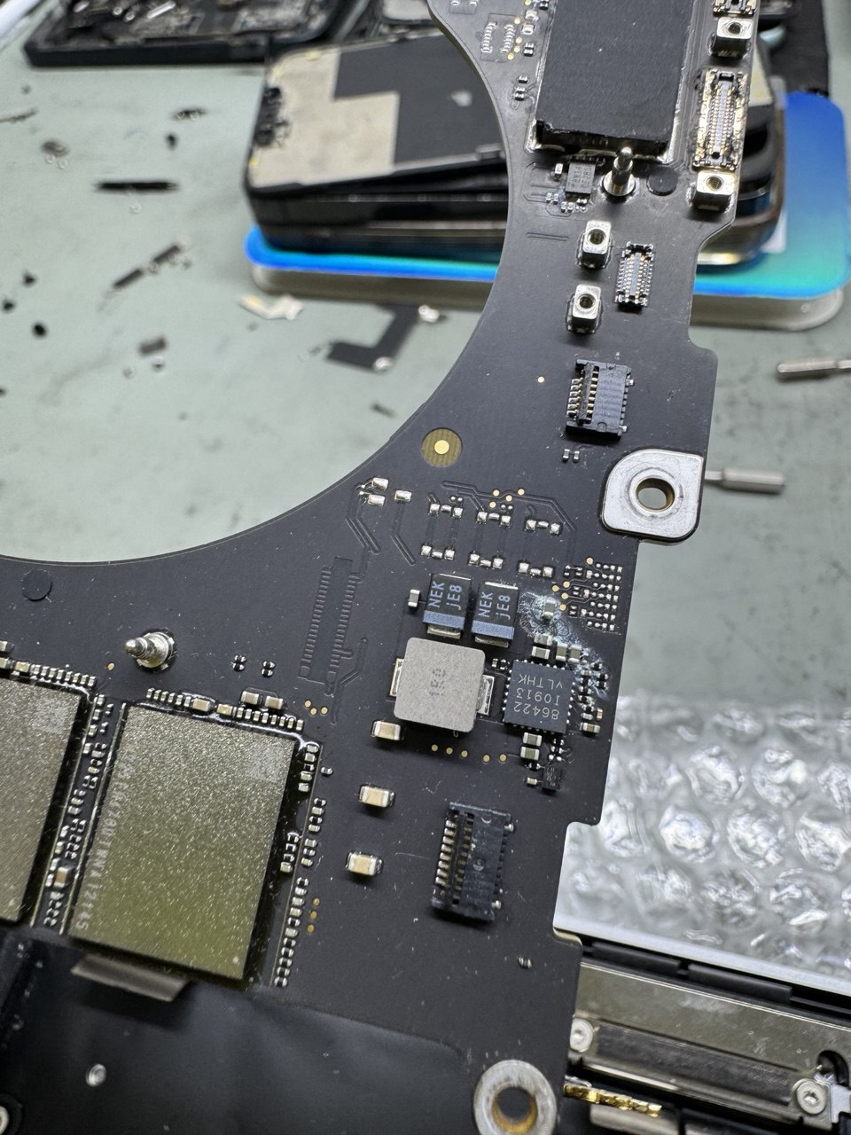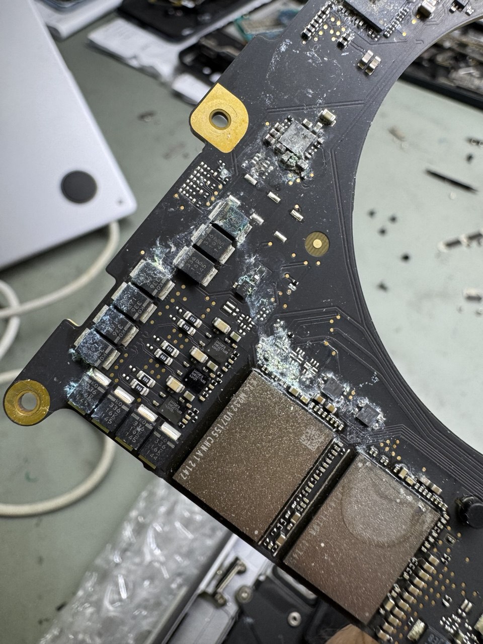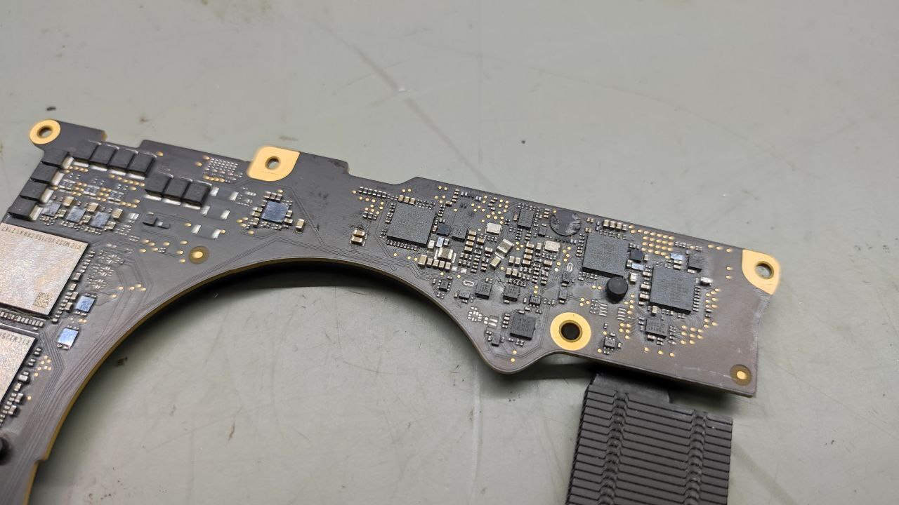 i got a Macbook A2442 which statrts normal but is not showing any picture. Using an external monitor works fine. After opening the Macbook i found a dried up line of liquid damage around CN979, RD503, and UP730. I cleaned up everything and also unsoldered the chips to clean the pads. There were no shorts before but i still don't have any picture. Sometimes you can see a glimpse of light in the middle of the display.