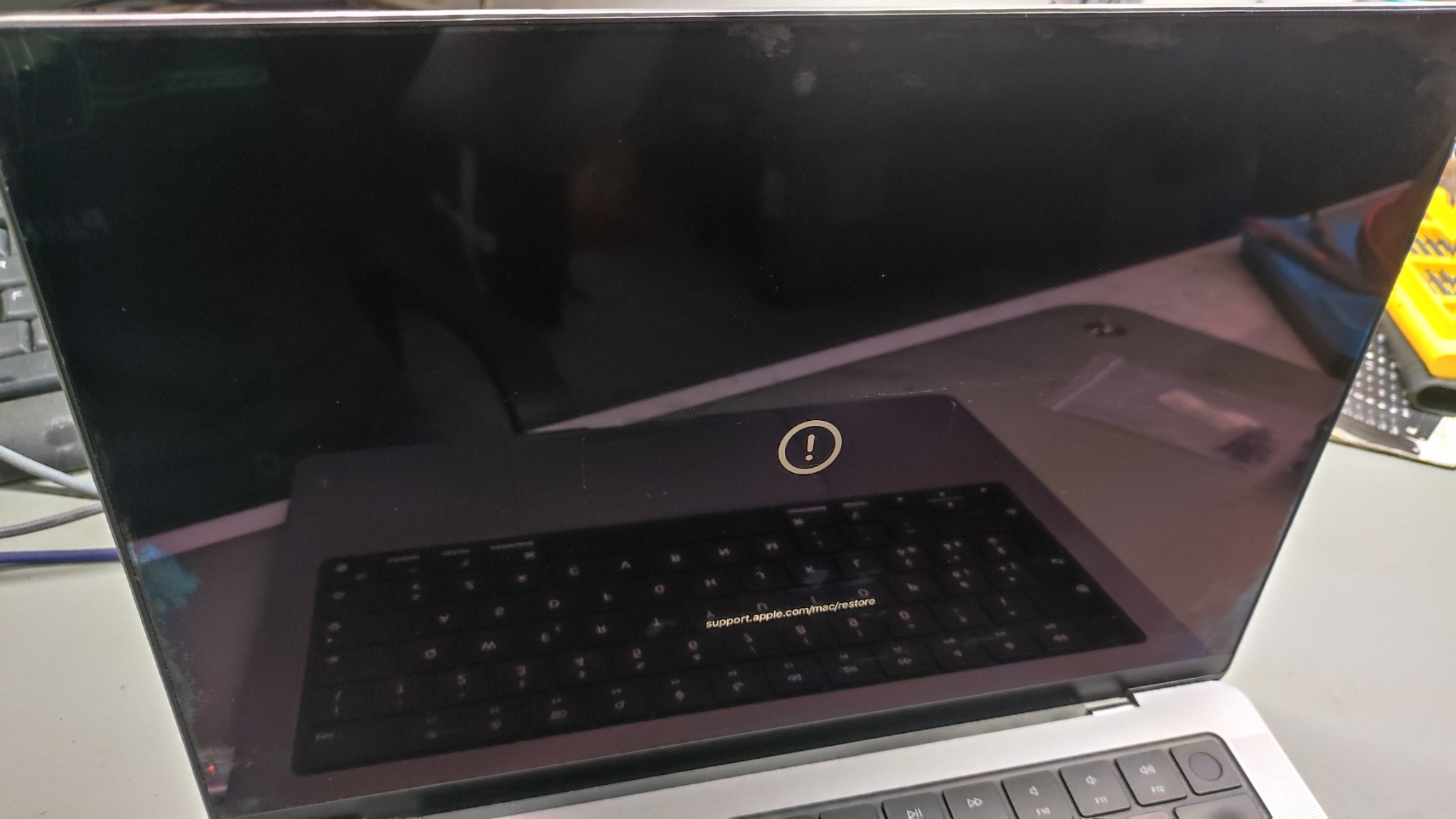 Fortunately the Mac is still alive but it shows an exclamation mark in a circle (!) (Apple T2 fw issue?) with the text "support.apple.com/mac/restore" and doesn't go further.