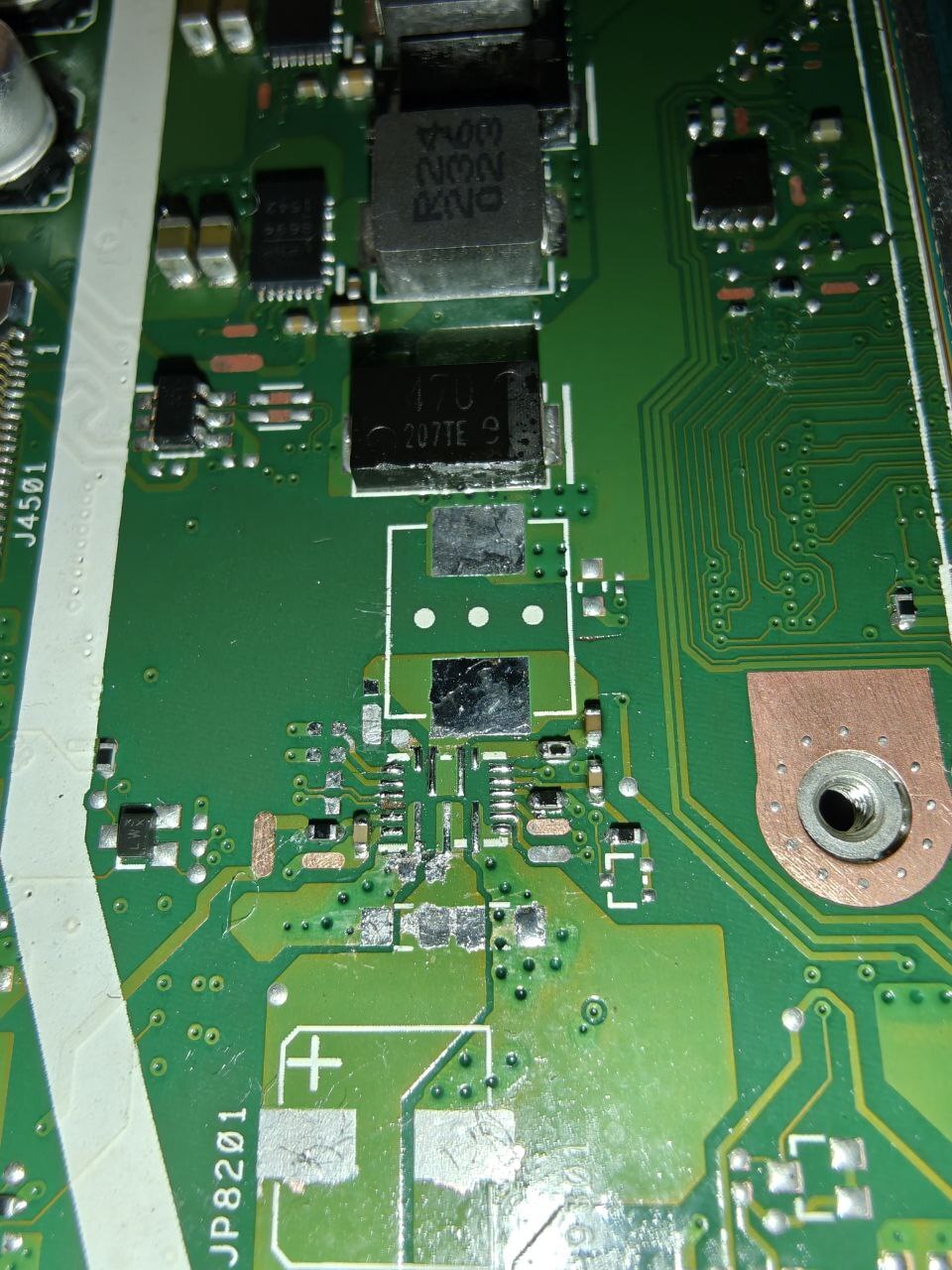Hello. I have a X415JA rev 4.2 motherboard. I had a short circuit on the main B+ line — the faulty component turned out to be the MP2941BGL chip. Unfortunately, before identifyingthis, I desoldered a few capacitors and a black component located around this chip. Could someone help identify what those components might have been based on the photos?