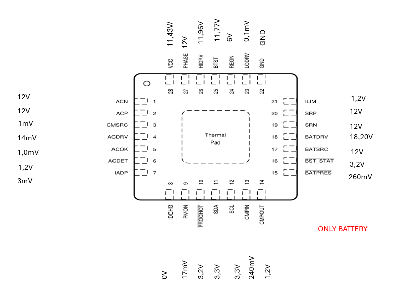 Battery is not the source of the 3v on data lines, it is coming from mainboards 3V rail, which is strange if you are saying that if running only from battery the 3v is present. It should be there when running from adapter also. Take the measurements again when running on adapter with and without battery.Hello, I checked the resistors, they are good, there is no 3V output from the battery data lines, the tracks to the charging chip are good, I checked the battery on another PC, it outputs 3V on the data lines