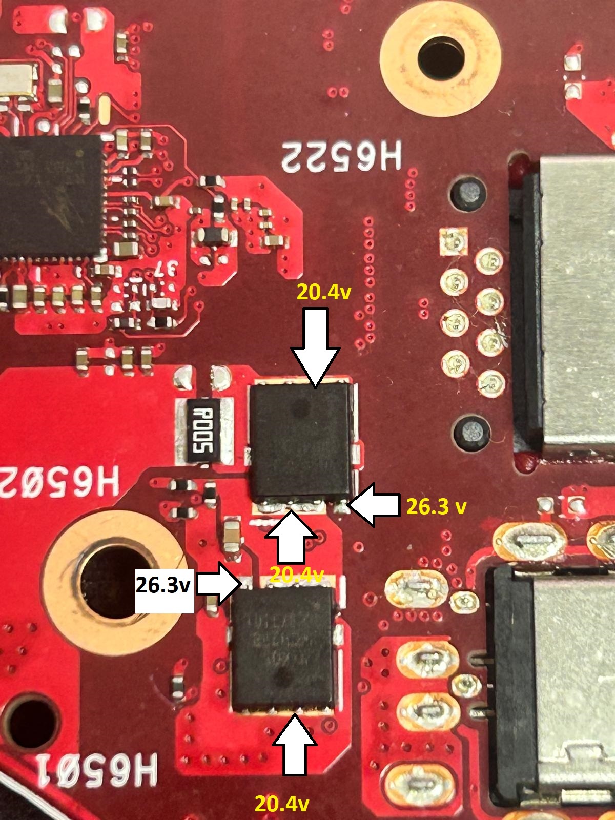 As a result, there were some blown components around the BQ chip. (The BQ chip itself - BQ24780S, the low side battery mosfet (shorted), and a resistor -> all replaced)