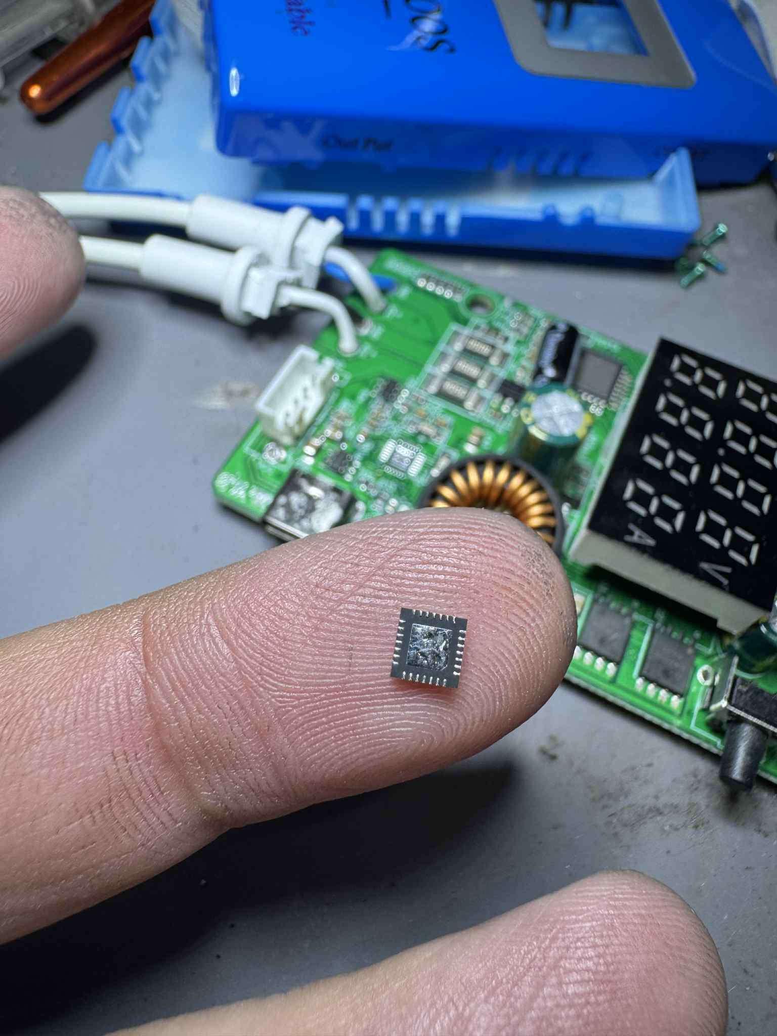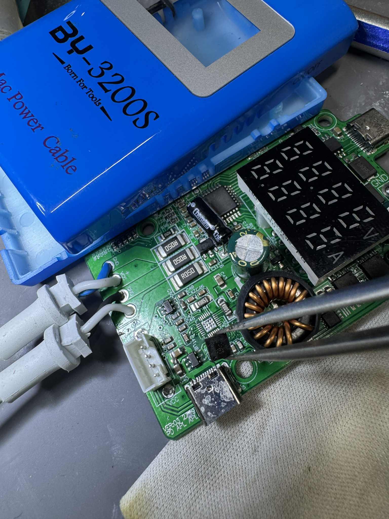 i have a BY-3200s that i am using for typeC and other charging plug/cable for macbook laptops. i have a problem in typeC cable charger that cannot charge. i checked the IC(in the PICTURE) can anyone have a test tools like this, i cannot trace the IC code because it is scratch by the manufacturer i think. i attached the pictures. so someone can help me find the correct ic for this. i test it is shorted when installed. Please someone help me with the ic so i can order online. thank you. Sorry for my english i am asian