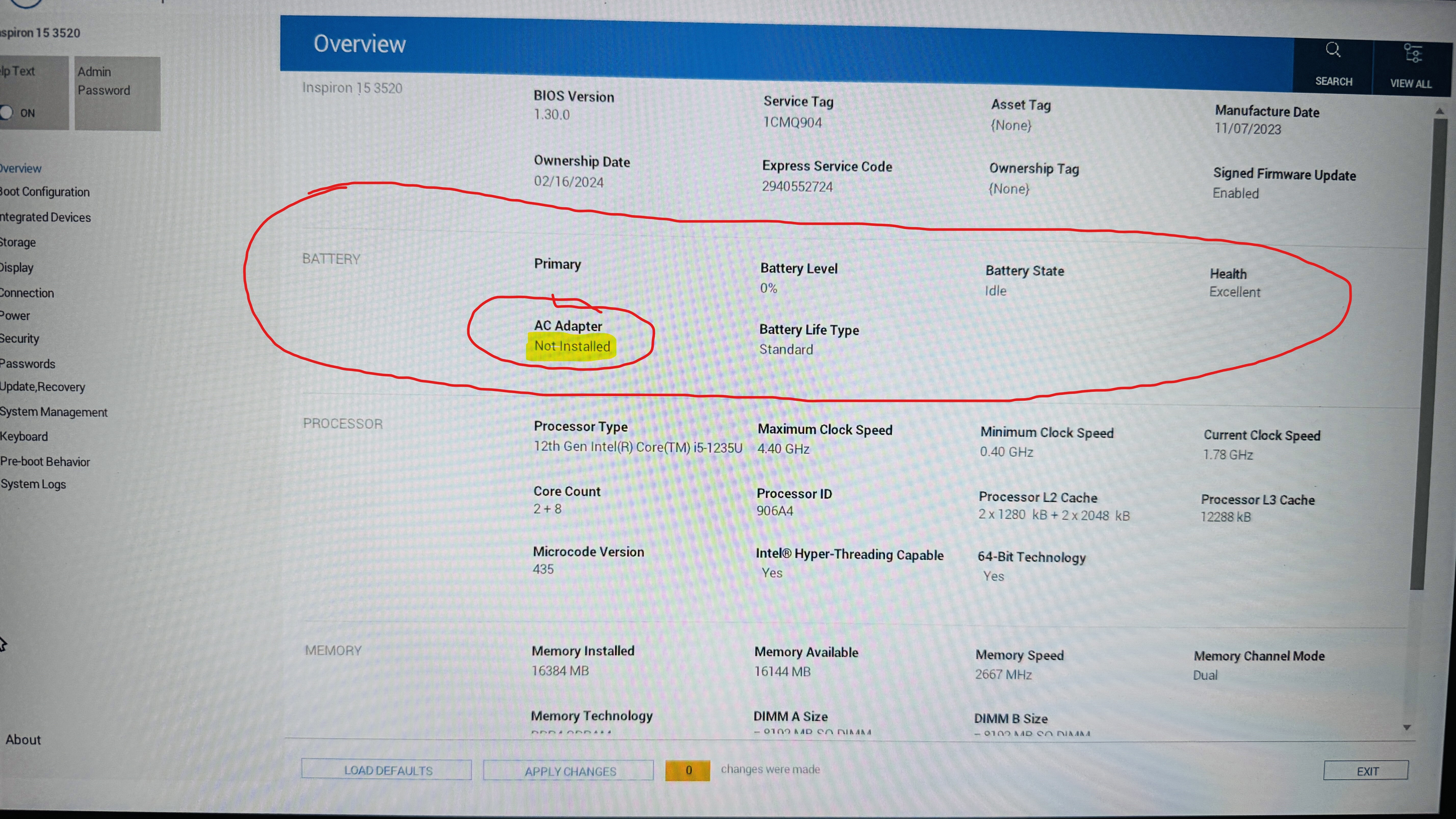 Dell Inspiron 15 3520 - AC Adapter shows "Not Installed - Not Charging