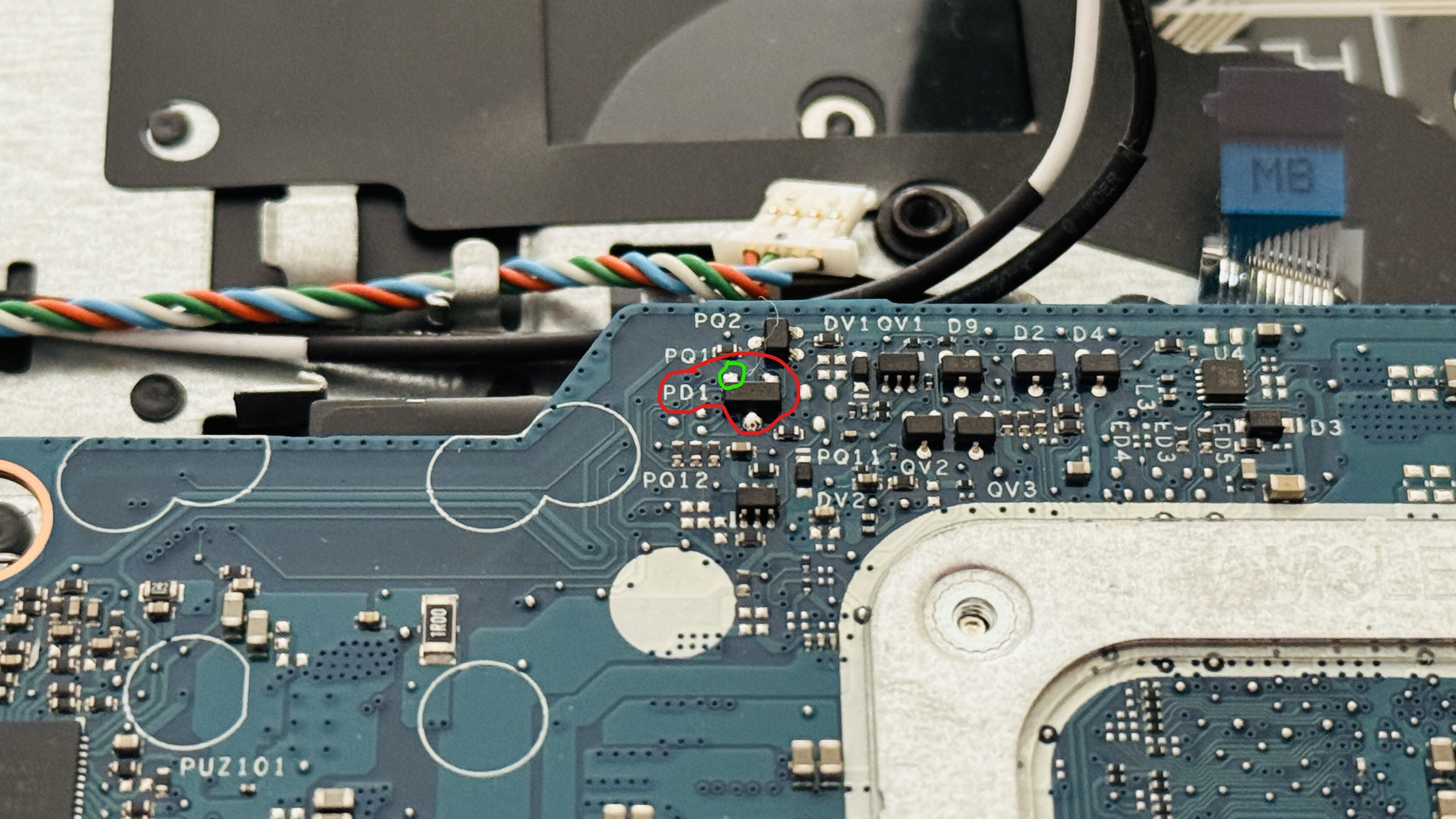 I solder a cable at pin (with green colour) because the component is at the bottom side of the PCB in order to measure the voltage of the PS_ID pin when I will turn on the laptop. After this solder when I turn ON the laptop the AC adapter was recognised, so I beleive was a cold solder joint. The voltage at the PS_ID pin before and after the PQ1 mosfet is 3.28V (Multimeter FLUKE 101).