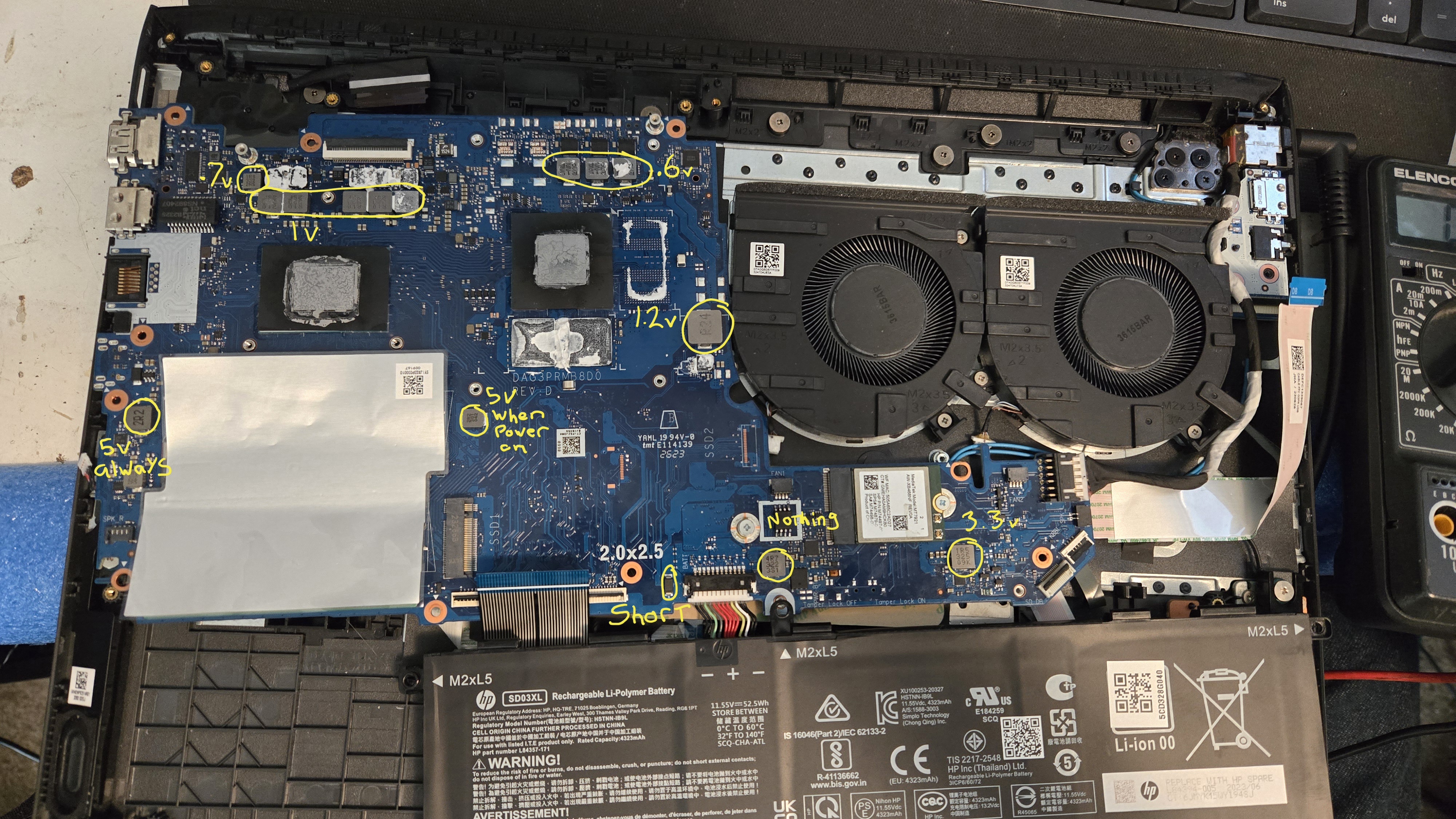 I'm looking for some general guidance. What should I look for next? I've tried looking for some schematics for this laptop but I understand that none are available. For the cap that I removed, would it be safe to inject voltage to see if there's another component that's causing that short, or is it normal? it's very hard to trace because it's a short to ground and the traces on the board are very hard to follow.