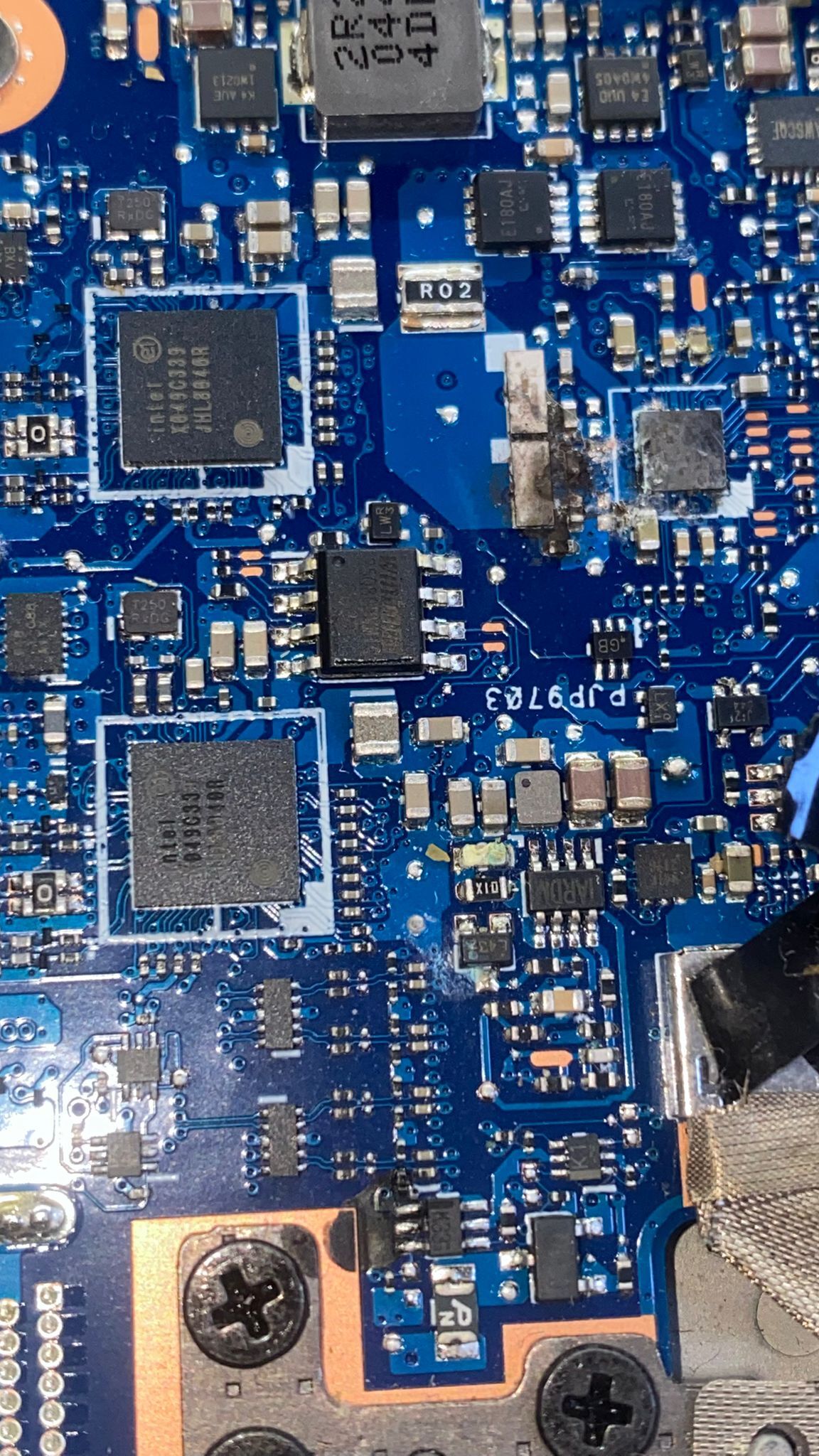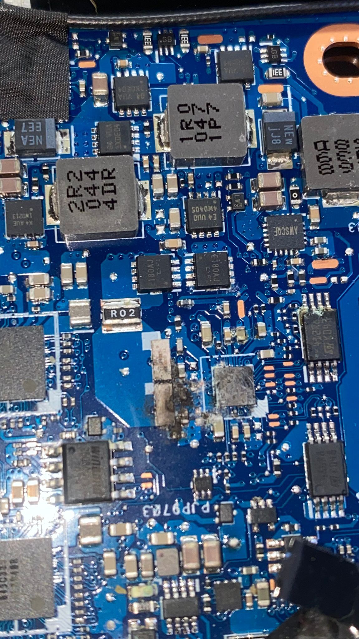 A few days ago, a client brought me this ZenBook 13 with a completely burned-out USB port, including the charger. Upon inspecting the motherboard, I found a lot of sulfate everywhere and a small explosion on the USB controller and the surrounding area (I've attached photos).