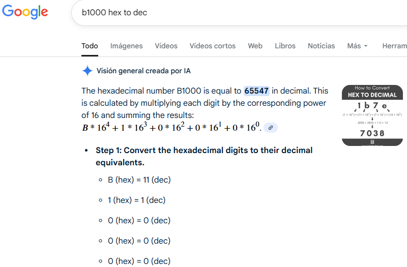 And Google doesn't even know how to convert hexadecimal to decimal nowadays (or simple math), it will give you a wrong answer at first, ask it "b1000 hex to dec"...