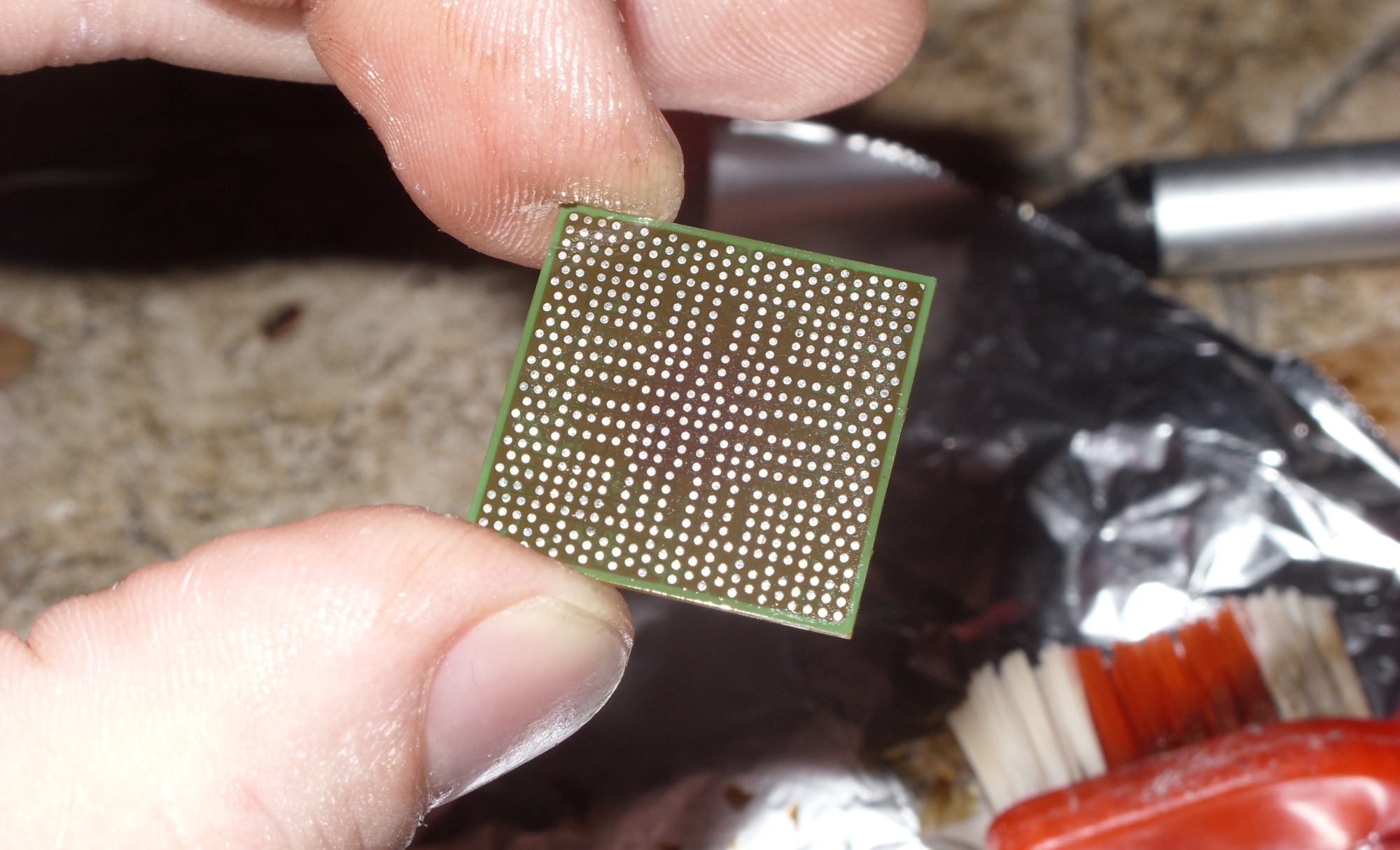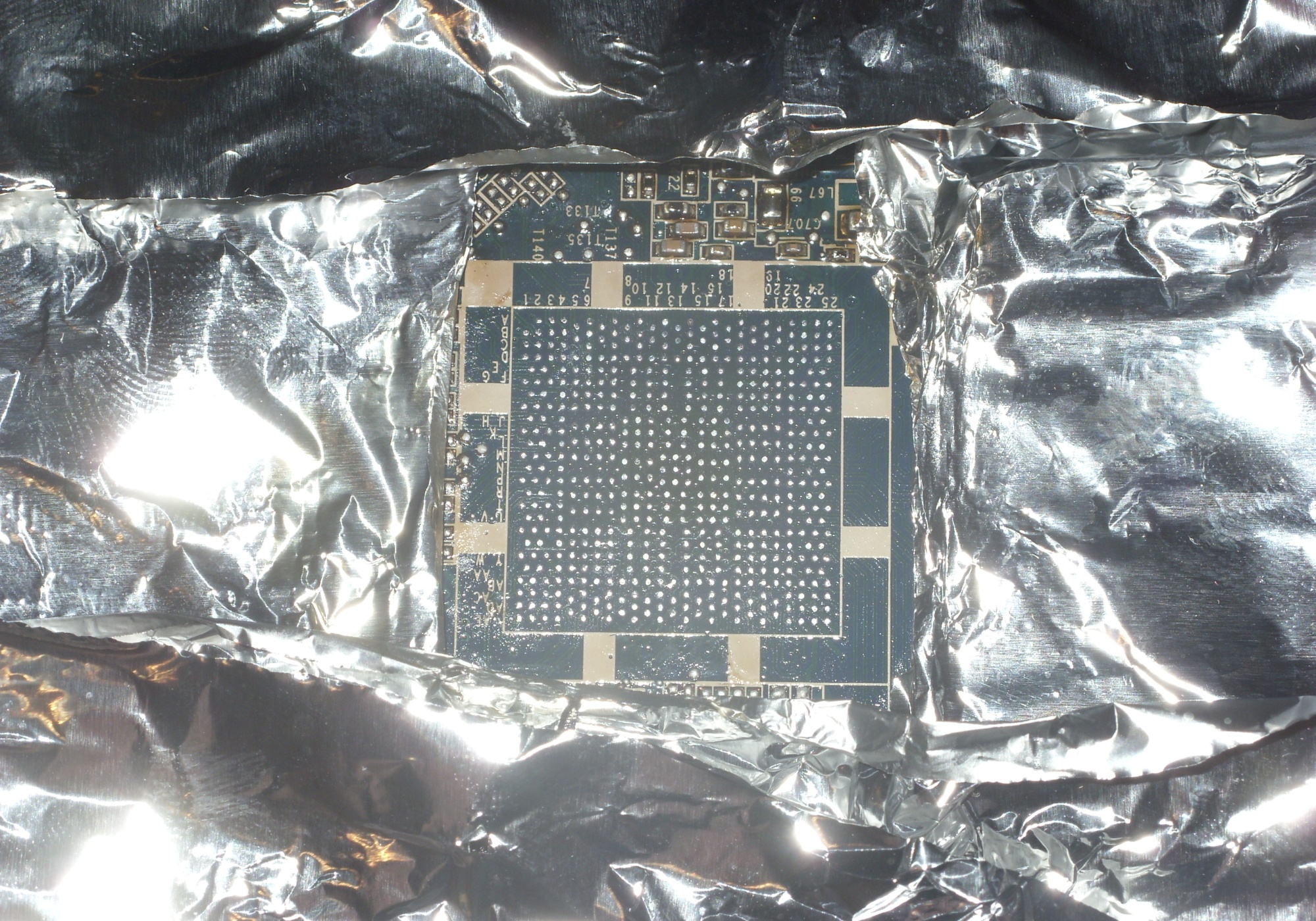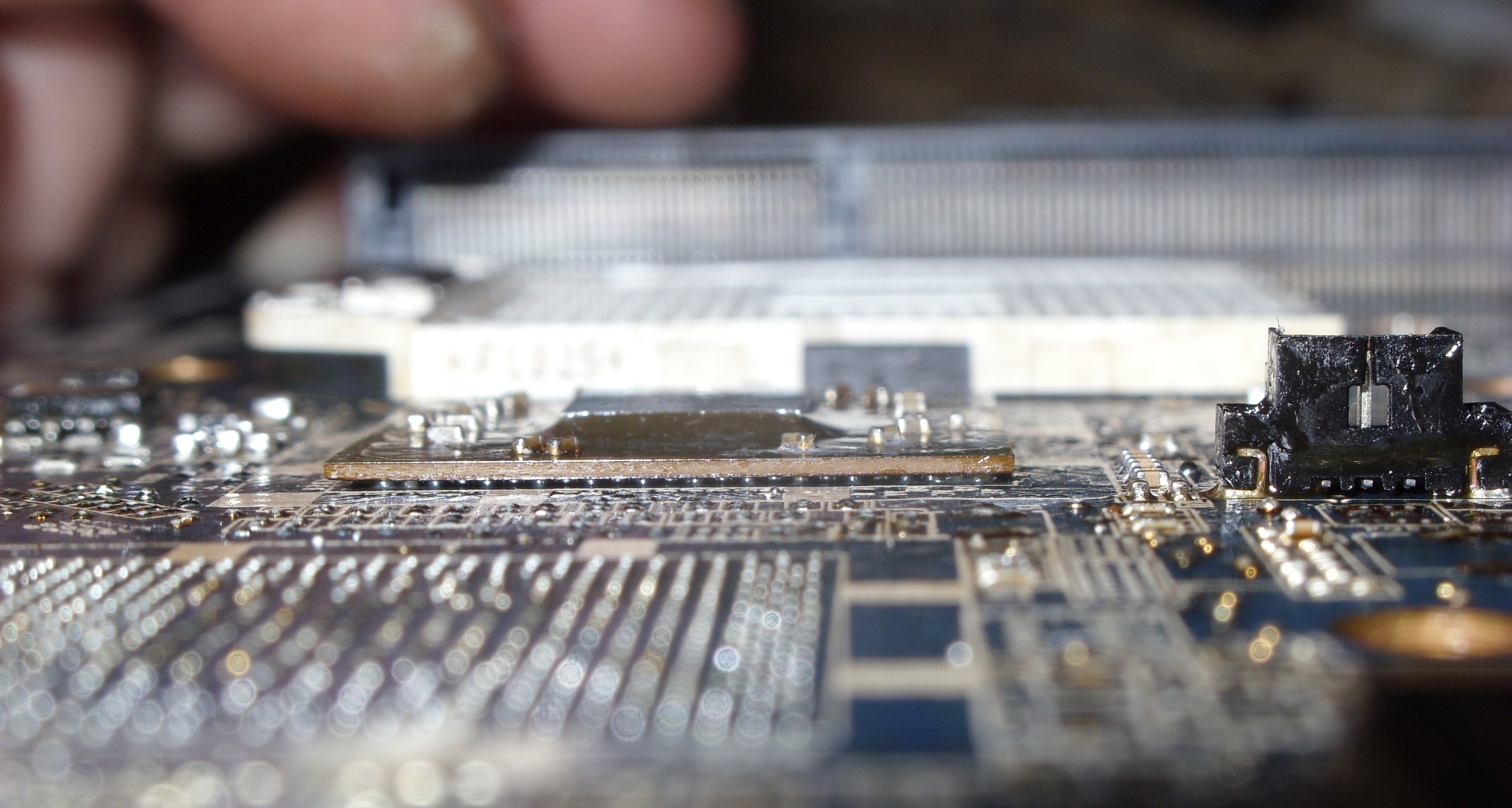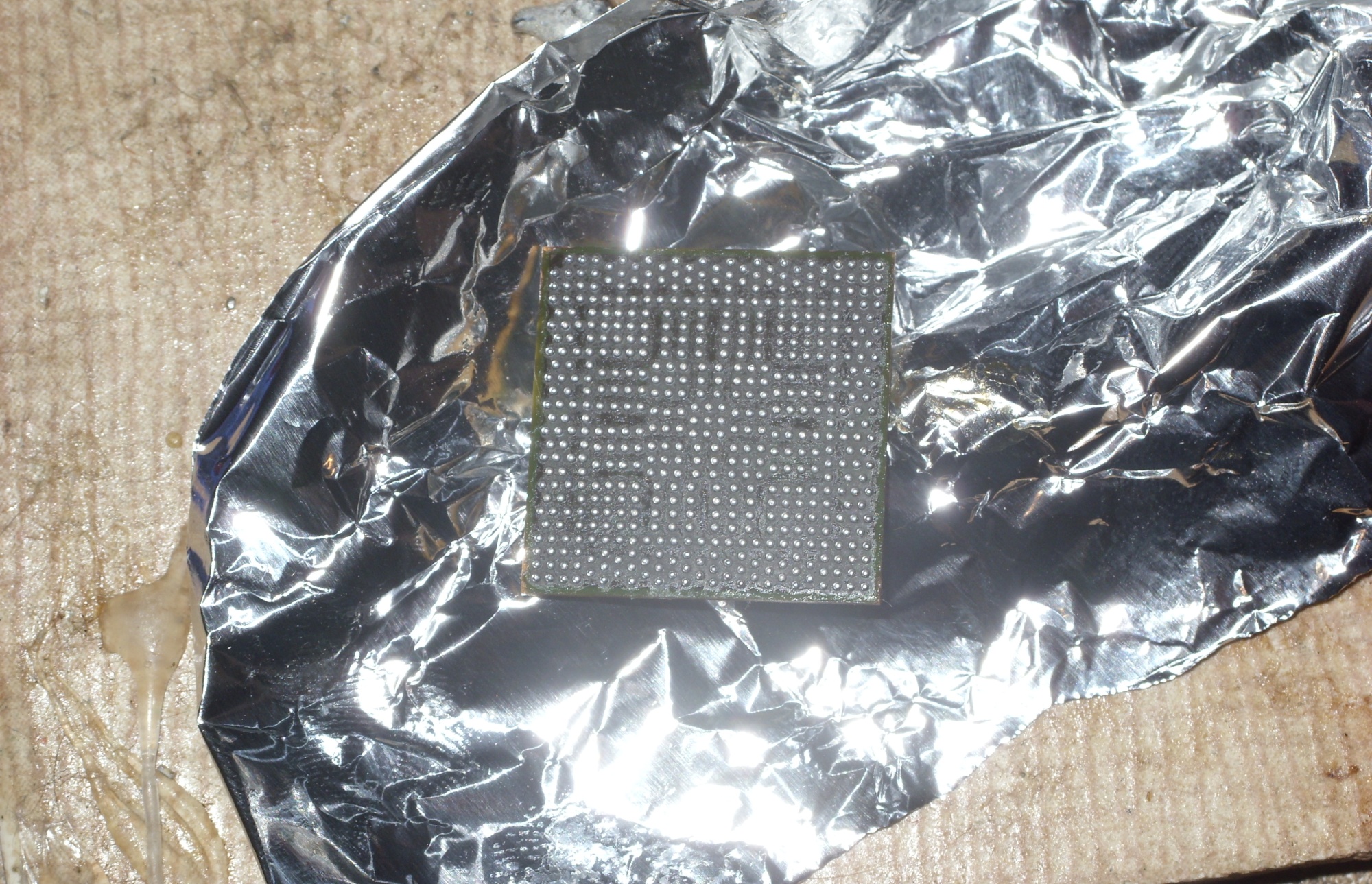 I took the NB off his board and there was discoloration under the die, both on the chip and the board. Something told me that the chip is toast, but i reballed it anyway. I put it back on and it would crash when trying to load the AMD driver, only safe mode worked. I removed and re-installed it but same thing. I removed the undervolting resistor (yes, i'd undervolted it too), no change. I then took the board back out and measured the capacitors on the top of the chip, and some sections indeed measured shorted. This was confirmed later when i pulled the chip back out.