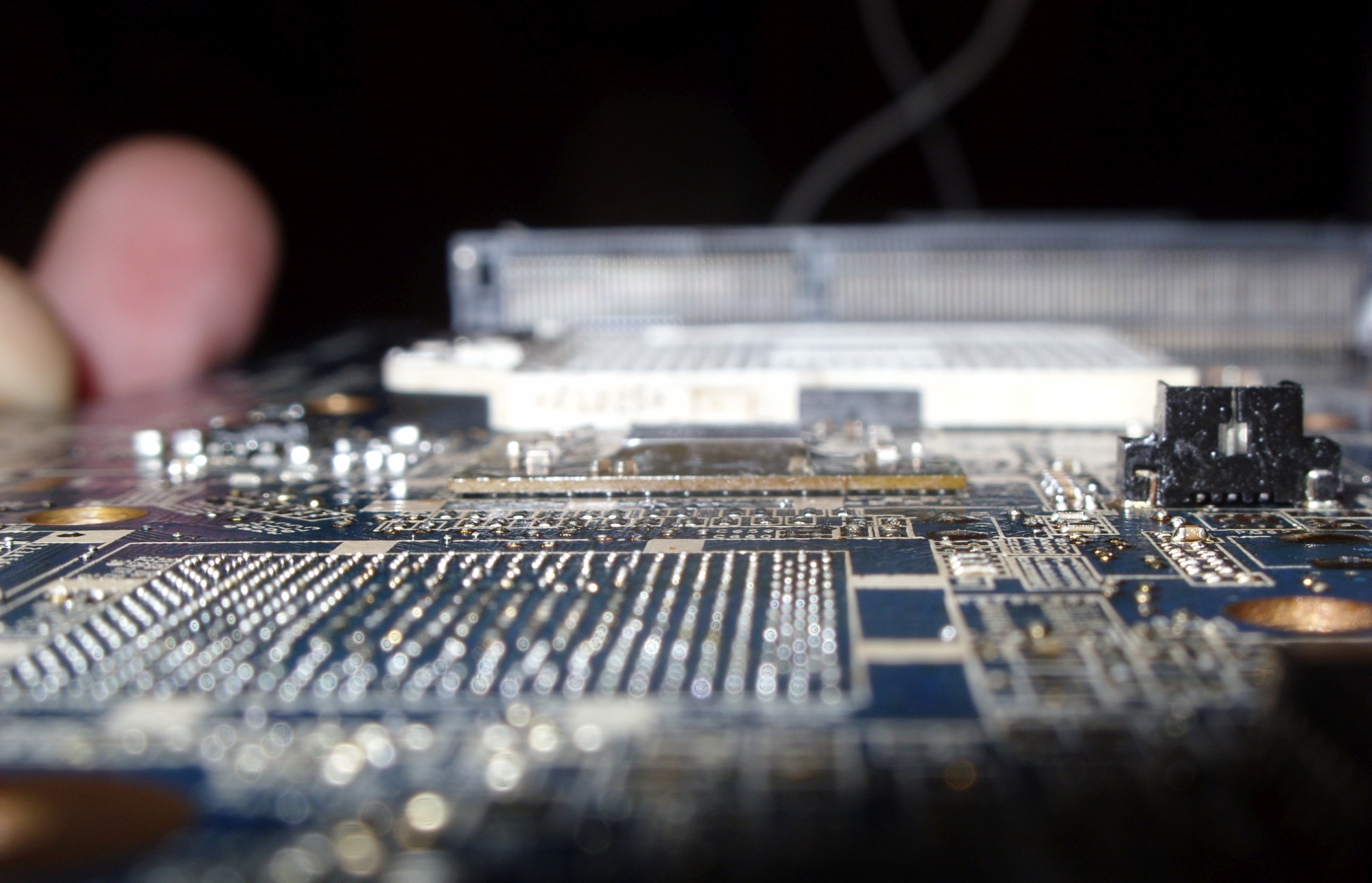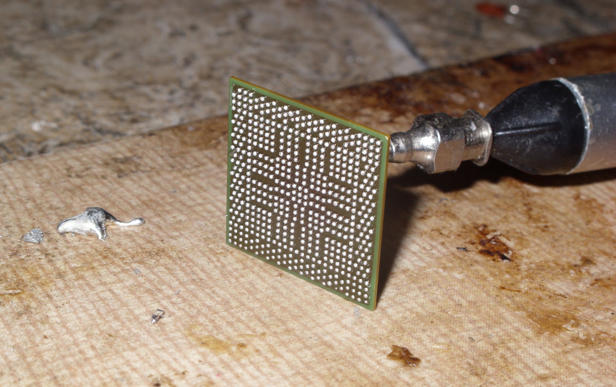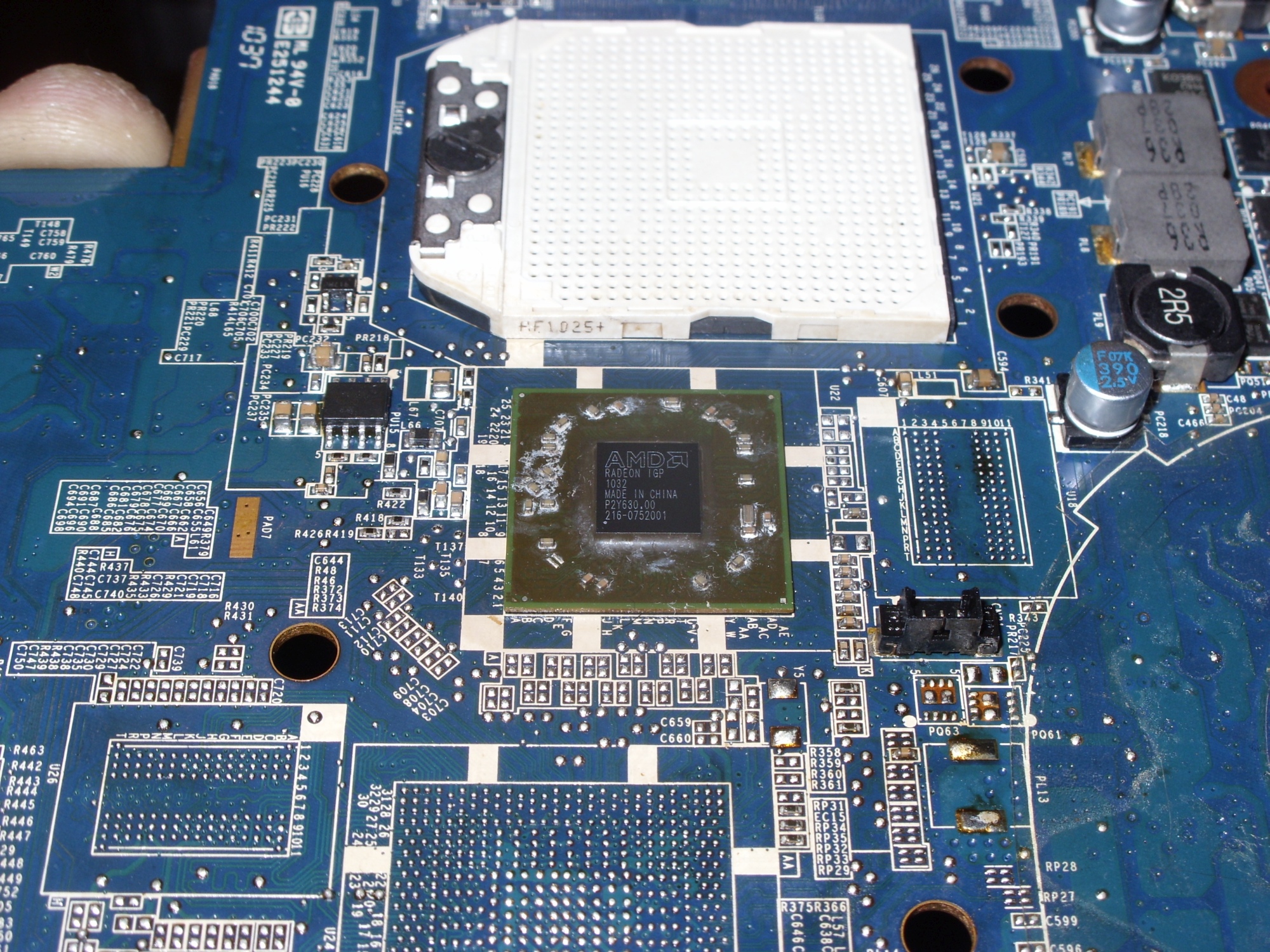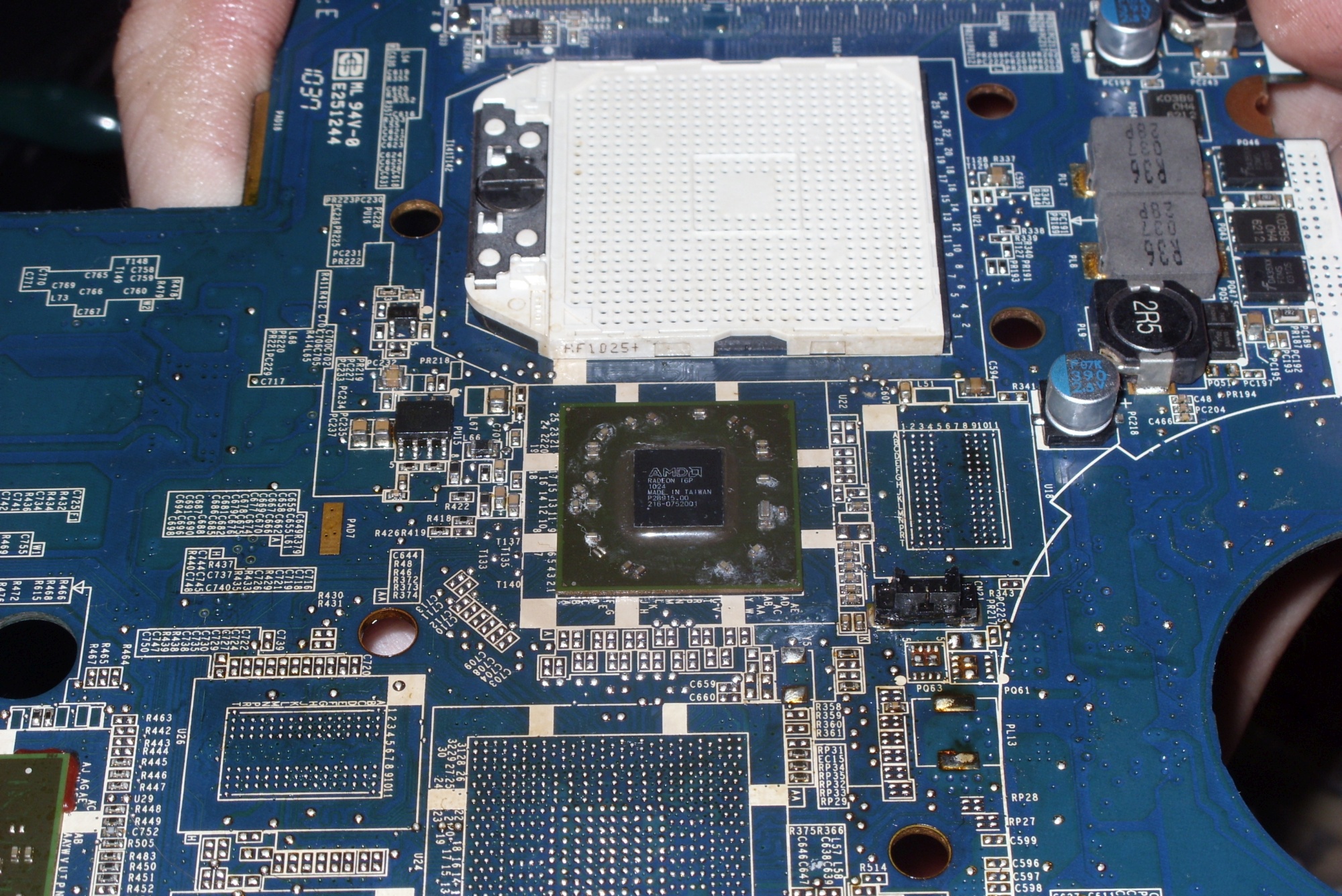 I took the NB off his board and there was discoloration under the die, both on the chip and the board. Something told me that the chip is toast, but i reballed it anyway. I put it back on and it would crash when trying to load the AMD driver, only safe mode worked. I removed and re-installed it but same thing. I removed the undervolting resistor (yes, i'd undervolted it too), no change. I then took the board back out and measured the capacitors on the top of the chip, and some sections indeed measured shorted. This was confirmed later when i pulled the chip back out.
