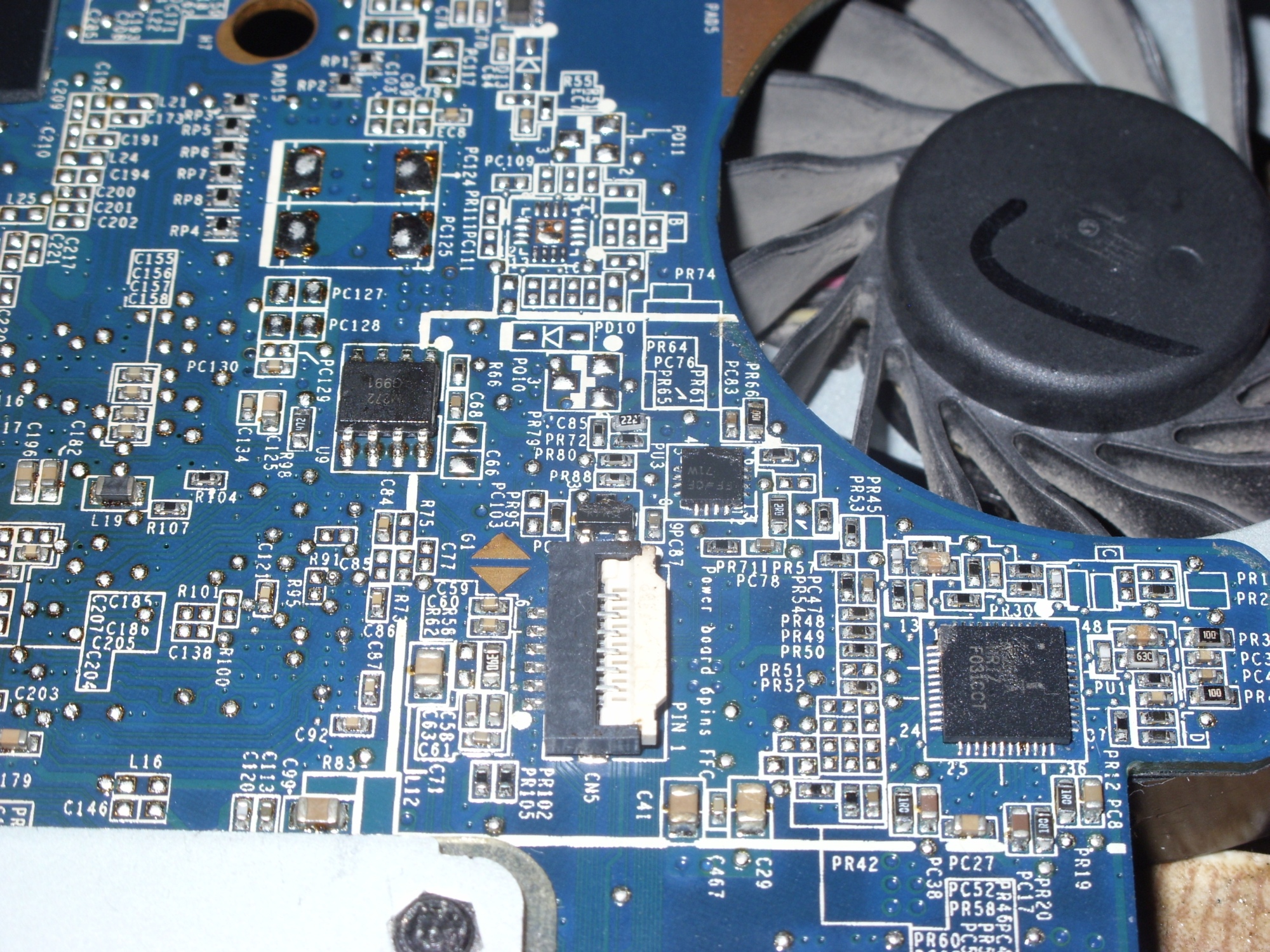 I had a spare RS880M so i reballed that one, lifted the original one from the board (again) and carefully cleaned the pads (again). I had some more solder mask scraping off but nothing that would make it short out. Soldered this chip on the board, it measured ok. Tried to power it on, nothing. No fan and just the wireless light on the keyboard lit up.
