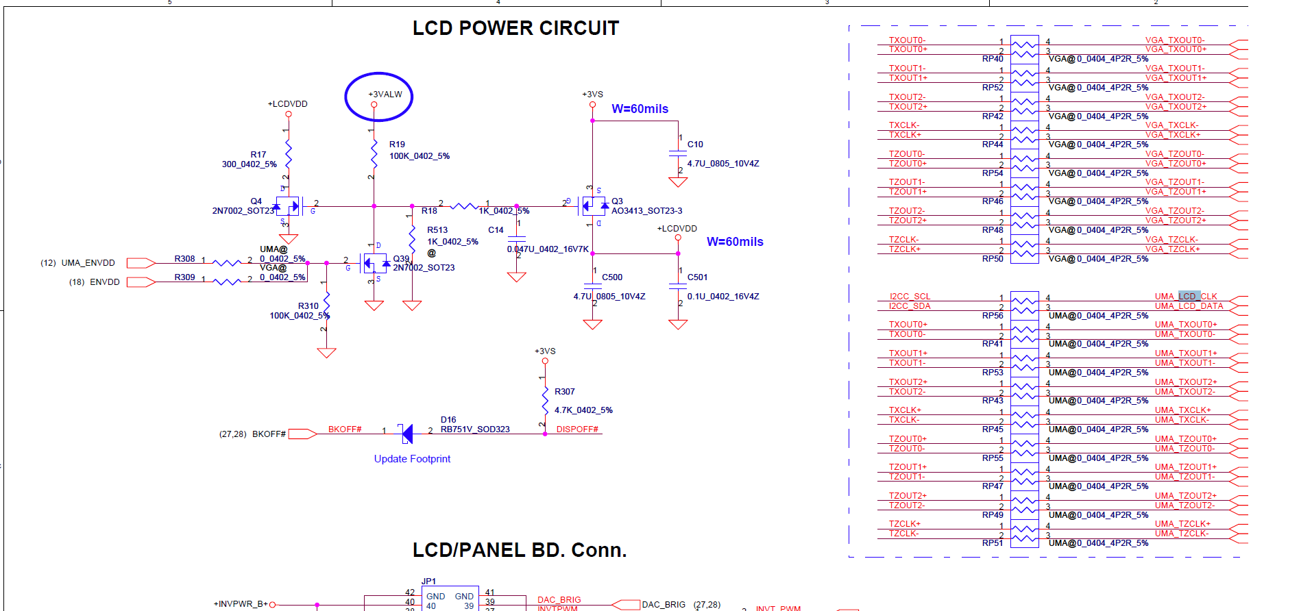 I have image problem on acer aspire 7520.When laptop is connected to external monitor works fine,but on main lcd ther is no image or backlight.When i mesure voltage on lcd connector i get everything except LCDVDD,Do i must check for something else or i can say that lcd is dead, and i'm little bit confused to understand that lcd power circut (check schematic picture) can someone explain me that briefly.