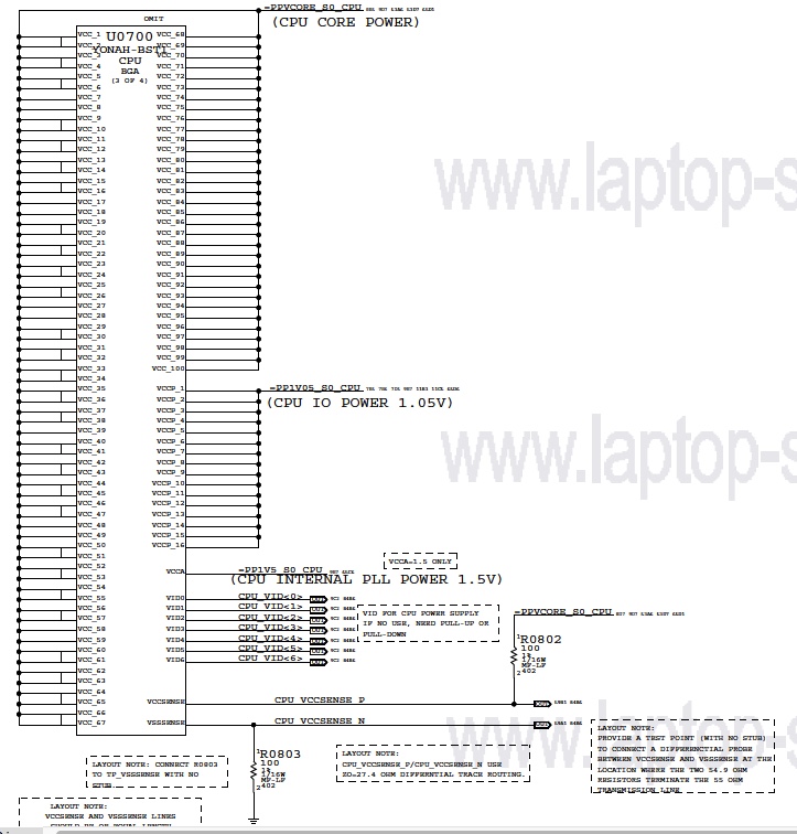 I first thought that the U0700 CPU might not be getting power. U0700 requires three sources of voltage - CPU CORE POWER (PPVCORE_S0_CPU), CPU IO POWER 1.05V (PP1V05_S0_CPU), and CPU INTERNAL PLL POWER 1.5V (PP1V5_S0_CPU).