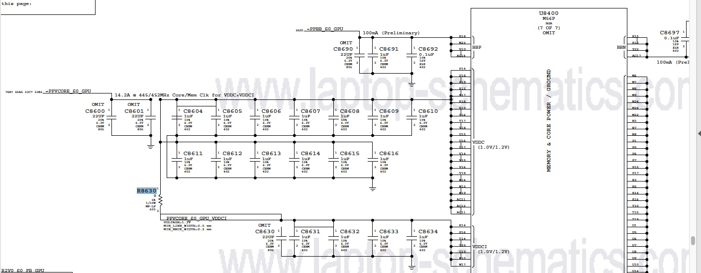 1) R8630 (0 Ohm) = 1k Ohms, 1.047; In addition, both pins are grounded. This resistor connects to VDDCI pins of U8400 ATI M56P GPU.