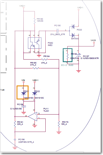 Even I didn't see it at first. It's the point labeled "VAD-1" that connects both circuits. You can see it in small red text next to PD16.