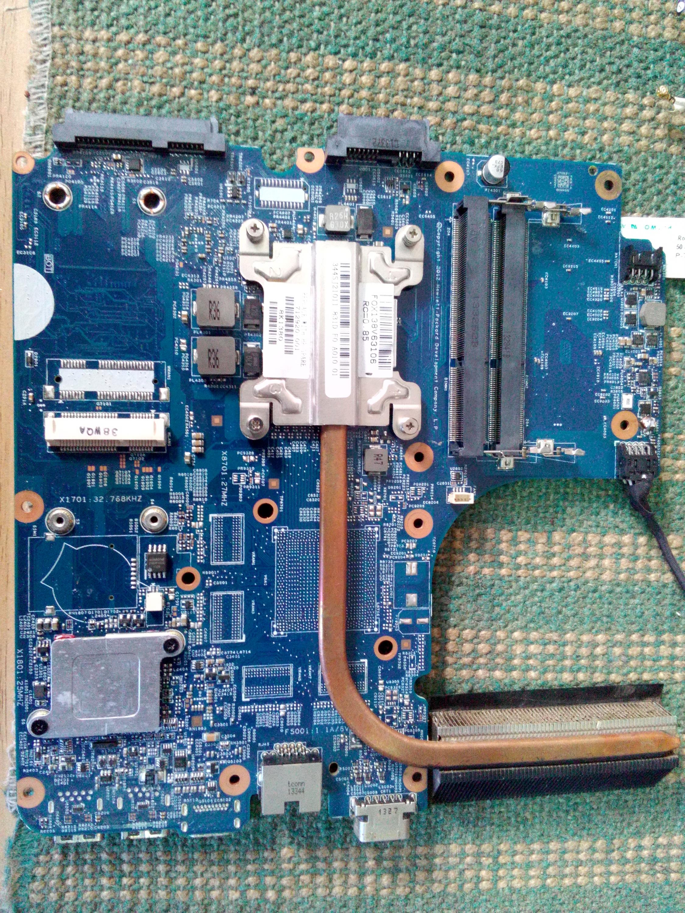 Stripped down to the bare motherboard. The original HP battery, when disconnected from the motherboard, is reading 0.00v - possibly some sort of protection...