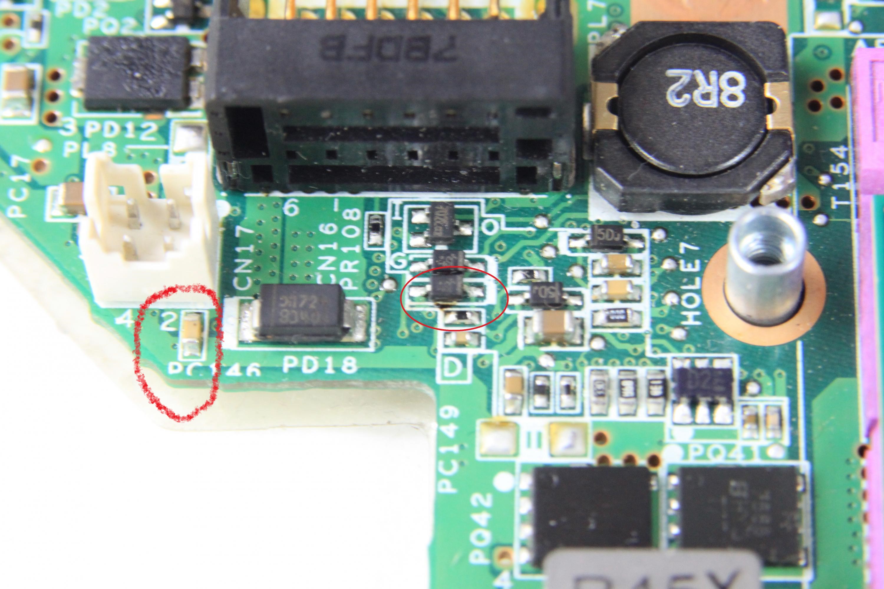 I was trying to start my friends DV6000 by shorting the terminals where the flat ribbon connectors locate to the power button and the cap circled in red next to the power in plug blew.
