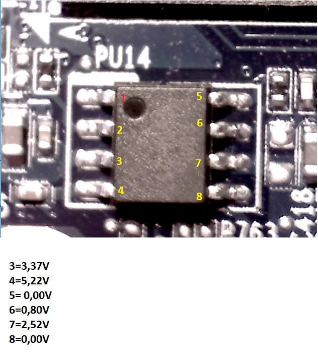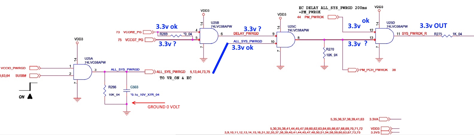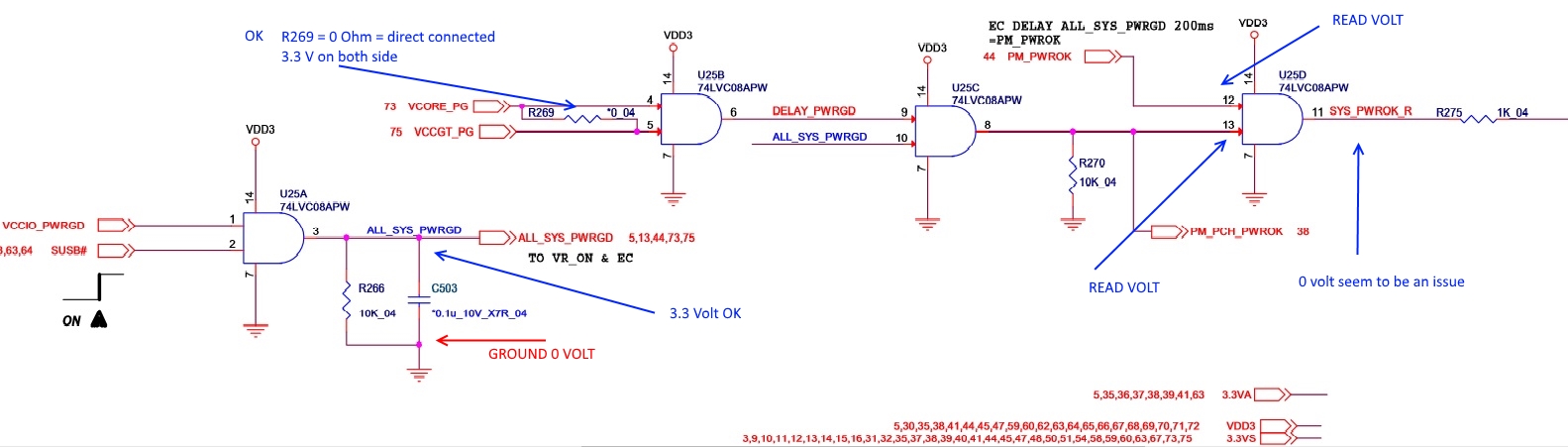 CPU VCore present but GPU VCore not present means BIOS not POSTing. Either because it is not loading at all (you could see that with an oscilloscope on BIOS ROM data pin), or a component fails to initialize. It could be many things, so it is hard to diagnose. A POST card may help as @ktmmotocross suggested. It could still be BIOS corruption, even if it does not happen that often.