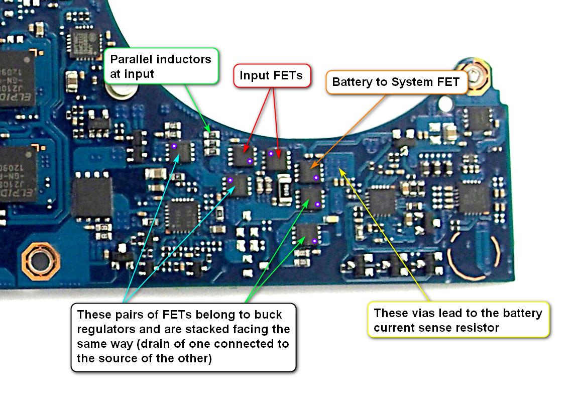 When you glance at a board and want to find the input FETs, you can eliminate many possibilities right away. The large coils are part of buck regulators, and the associated FETs (or drivers with integrated FETs) must be as close as possible (for EMI reasons). Any 8-pin package that doesn't have 3 pins connected together on one side and 4 pins connected on the other is not a FET. Etc, etc.
