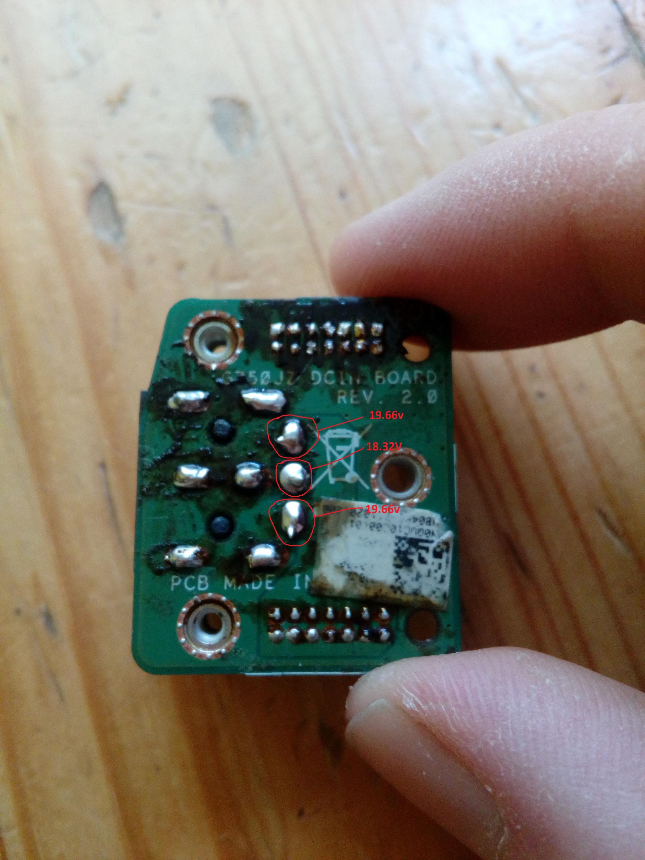 So i took multimeter and checked the power supply whitch reads 19.65V on inerwall and 18.36V on center stick.