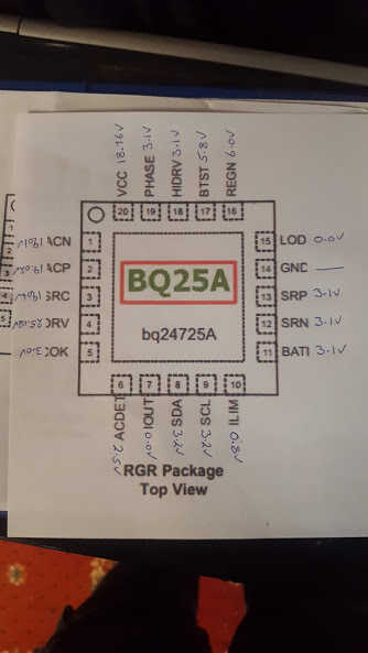 I'm just an hobbyist starting out in this stuff, but the voltages on the BQ24725a look fine to me. VCC,REGN, ACDET, ACOK all there. I'm assuming that the ACOK is being pulled to a 3V rail, and not suppose to be some other rail?Comment