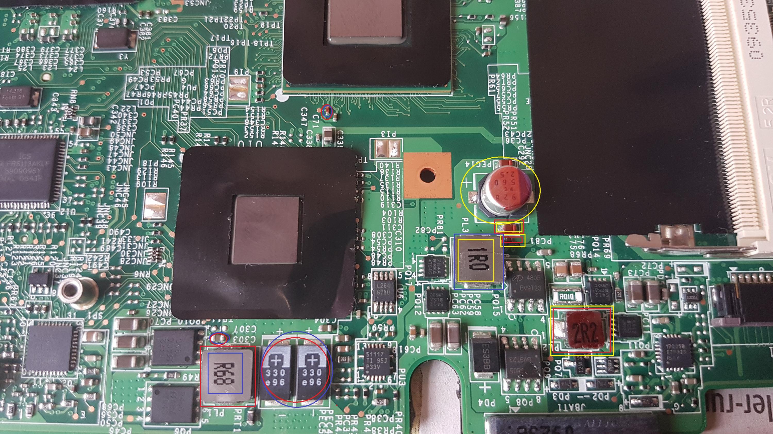 CPU or GPU voltages can be found on the coils near them. If you did not find those coils, measure voltage on all square-shape coils on the mainboard.