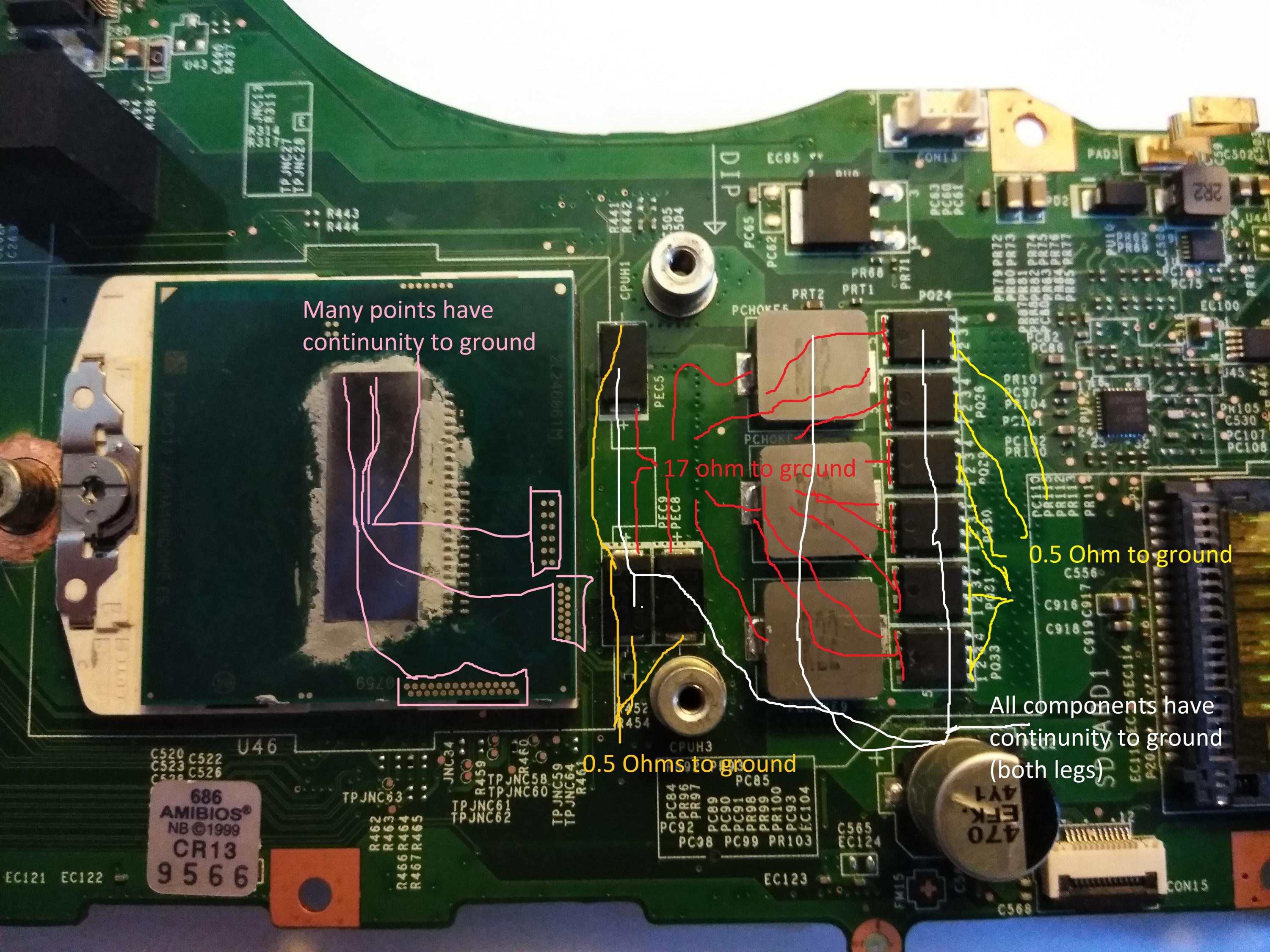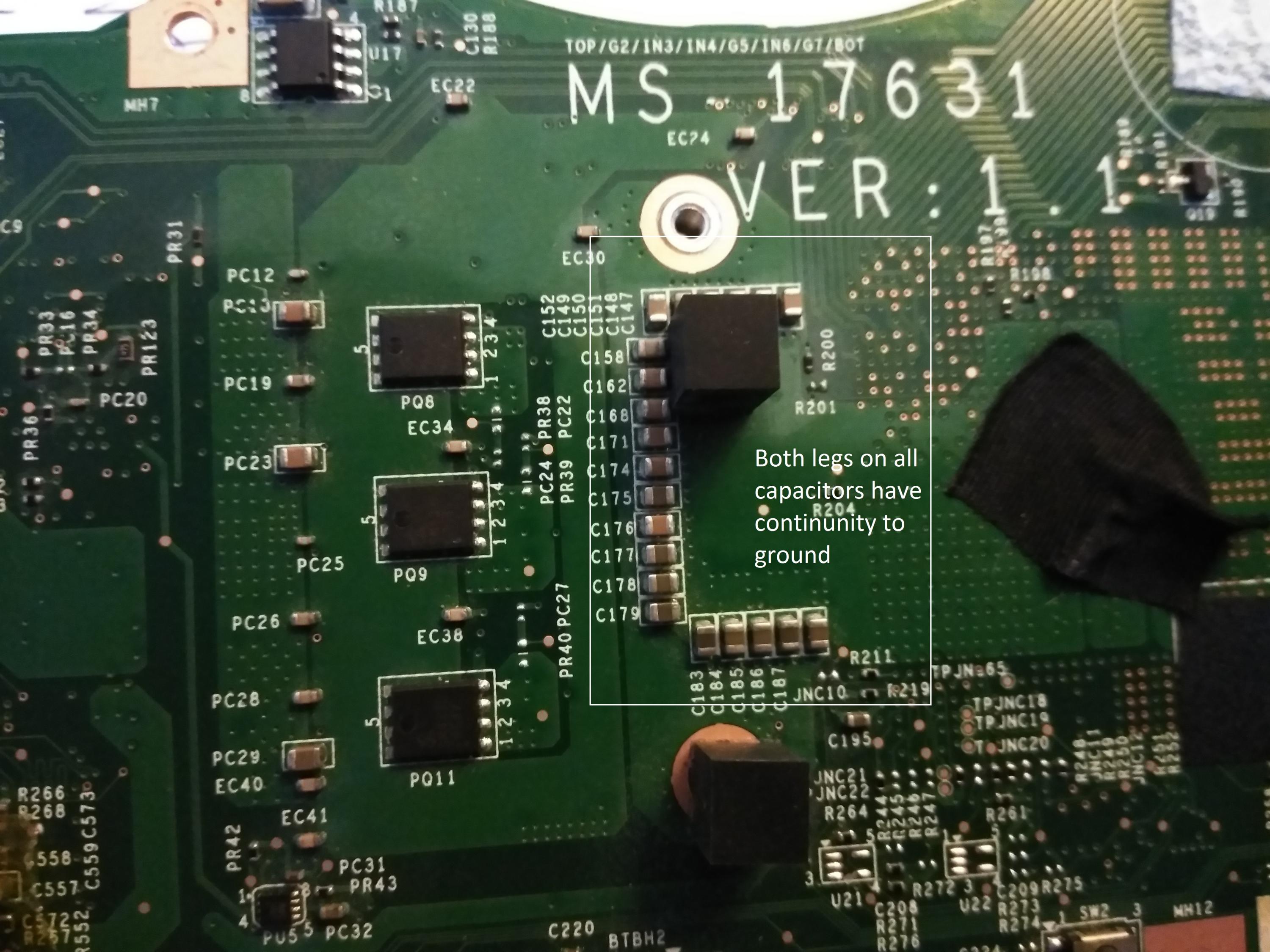 Originally I thought it was a bad BIOS tried re-flashing the bios with no luck, decided to probe around the CPU and i noticed i was getting continuity to ground on both legs of all the smd capacitors. Could this be normal? i noticed if i remove the cpu the caps are acting much more normal (one leg grounded, other floating). I am attaching some photos, i am asking because i never heard about a cpu going bad before. The motherboard is a MS-17631 ver. 1.1