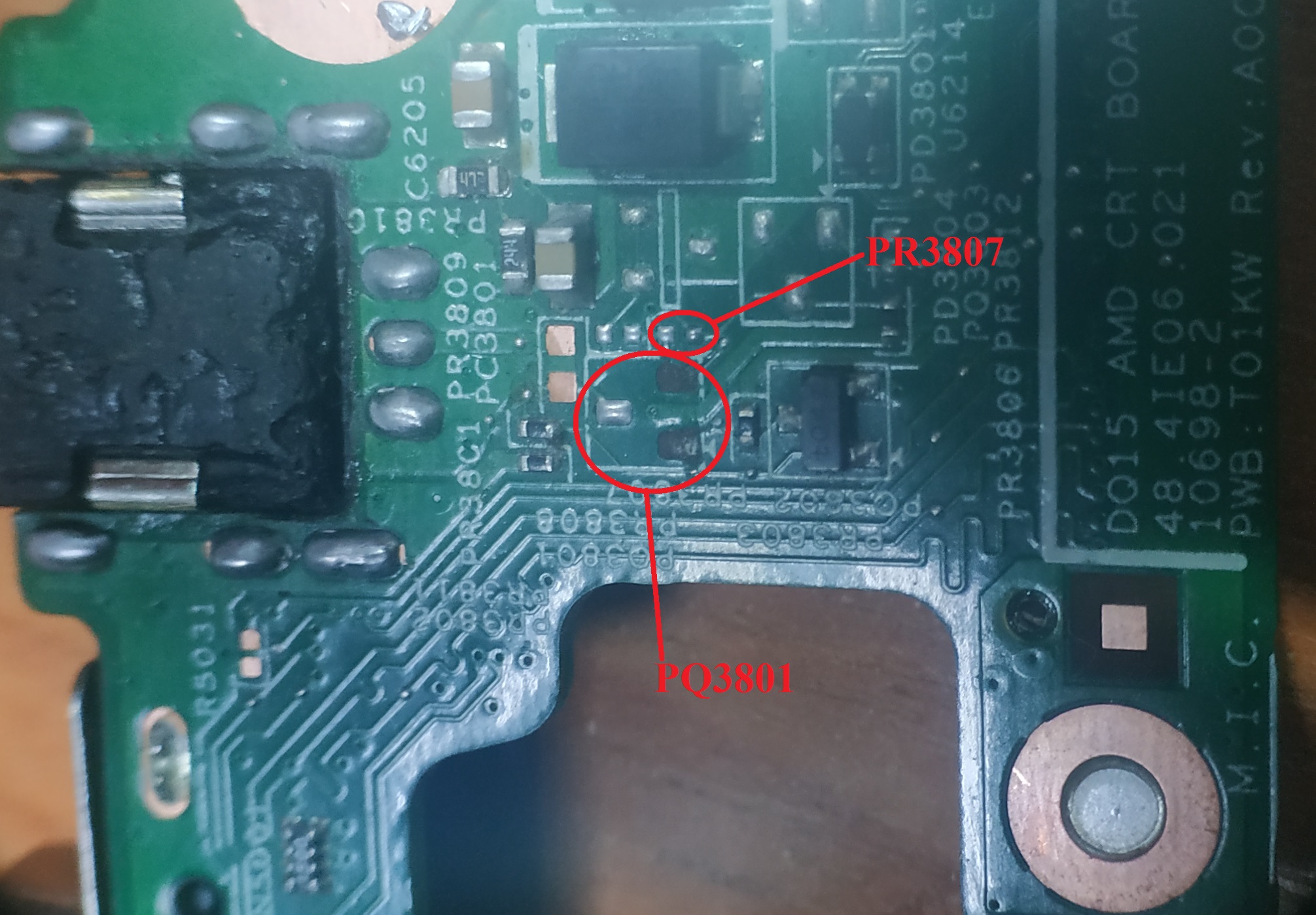 Good afternoon. There is a Dell M5110 laptop, a Wistron DQ15 AMD DIS board, 48.4IE04.021, 10246-2. The problem is the following: the adapter does not detect and the battery is not charging. Upon examination, missing elements were found on the CRT board (48.4IE06.021 10698-2). Namely, the PQ3801 transistor is missing, the contact pads underneath it, and the PR3807 resistor are also torn off. Judging by the photo on the Internet, the transistor - 2N7002K, I can be wrong, I attach the found photo for identification. But the value of the resistor is unknown. I would be very grateful for the help in identifying the elements. Thanks.