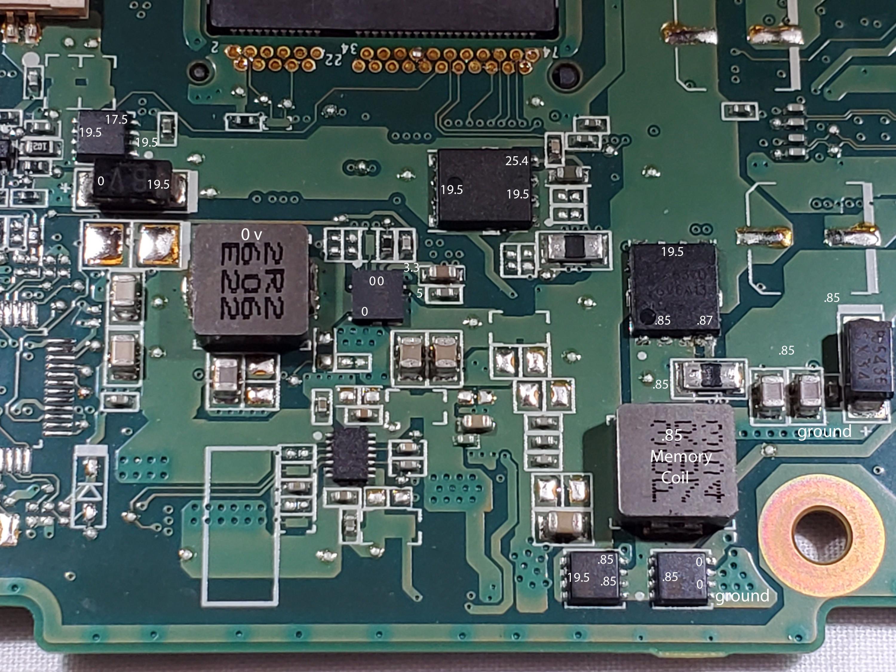 There is an IC next to the 1st coil that has 3 0v and 3.3v, 5v and 19.5v as listed