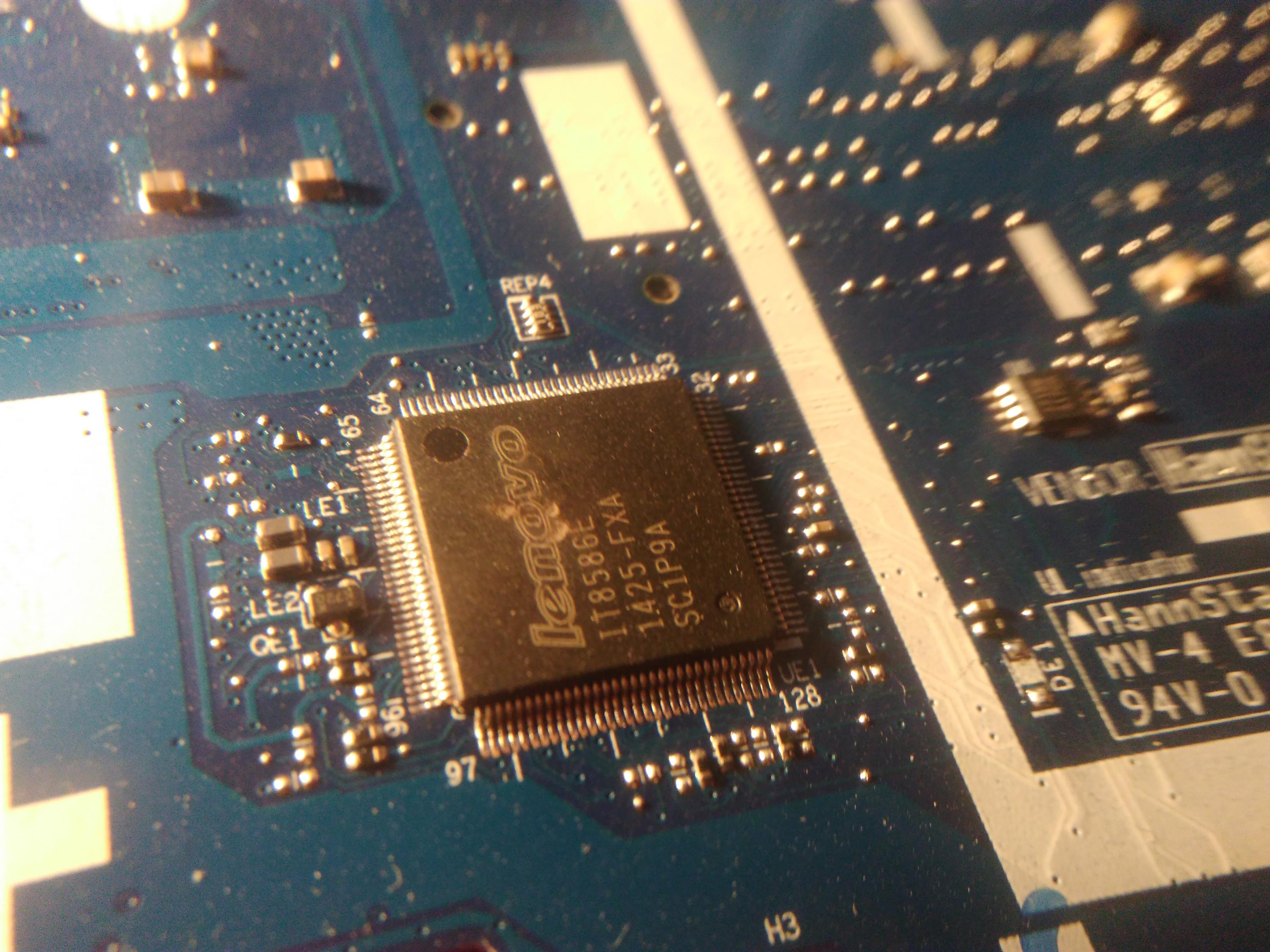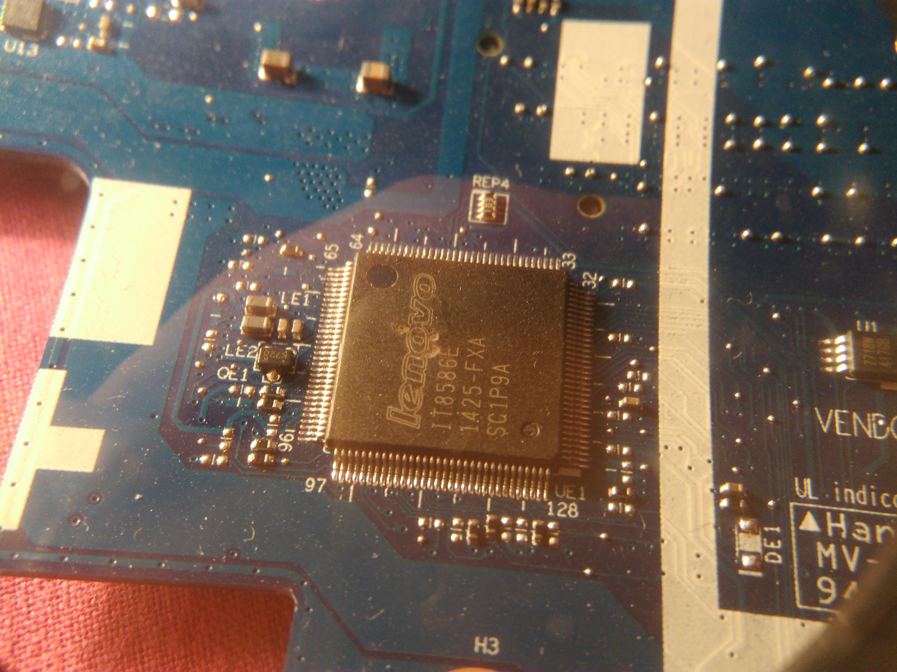 I got a new charging port but this did not fix the issue and as I was investigating the board I discovered the marks on the Super I/O chip. I wiped off what seemed to be a powdery substance that was exactly above where the marks are around the first 'o' in the lenovo logo on the chip