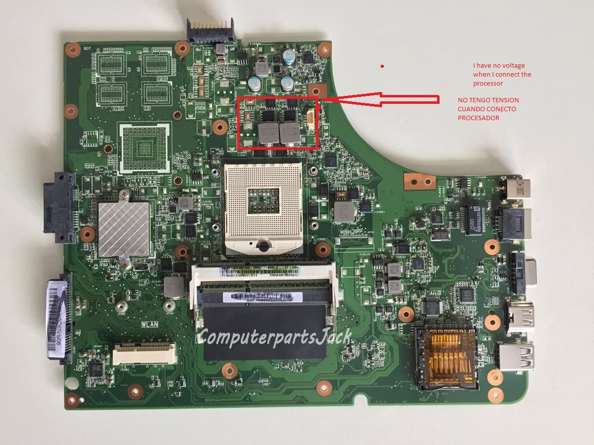 Attached image of the board and place where I have no voltage when I connect the processor, The picture is another board taken from the internet but it is the same as mine, I hope it does not matter