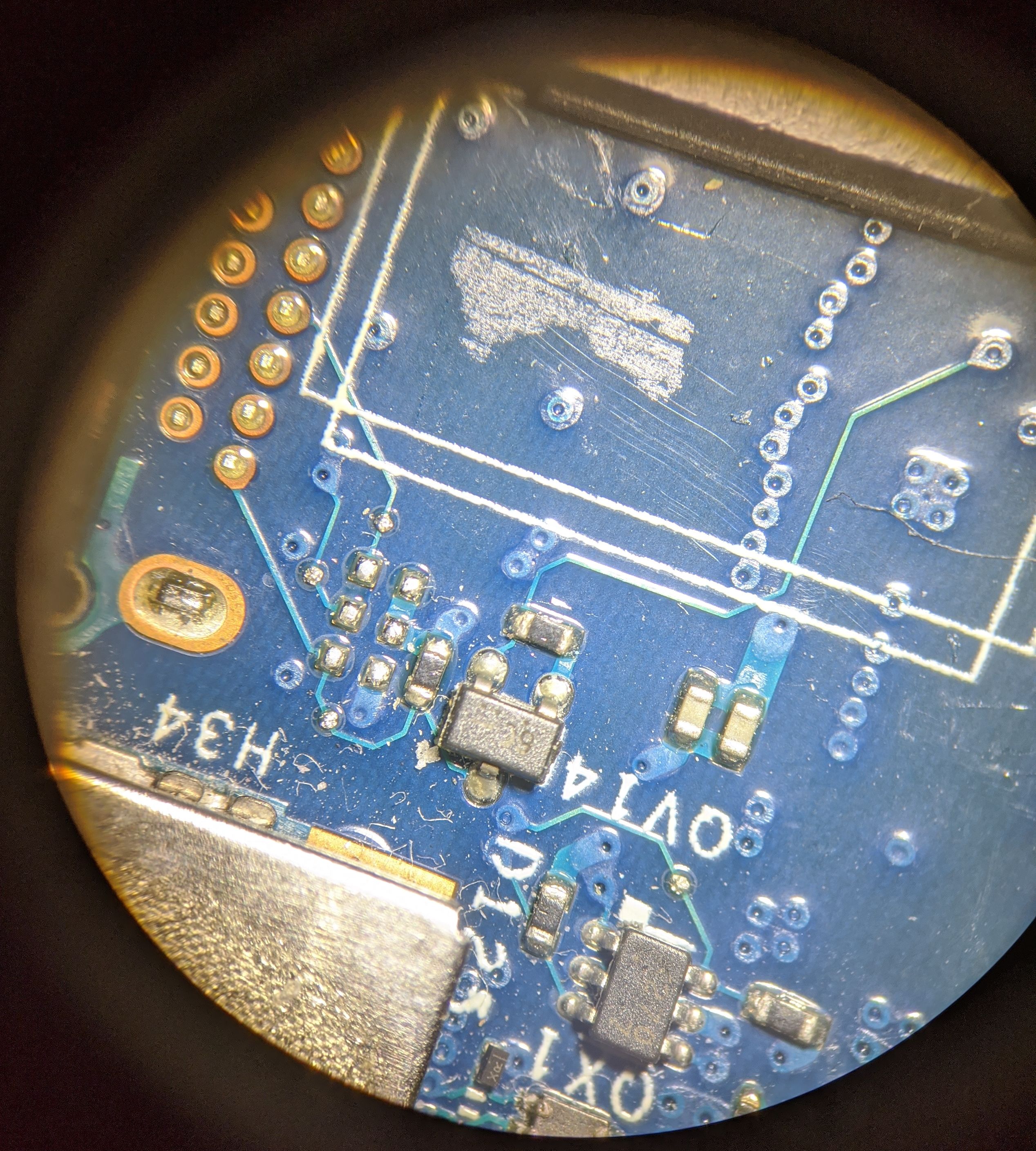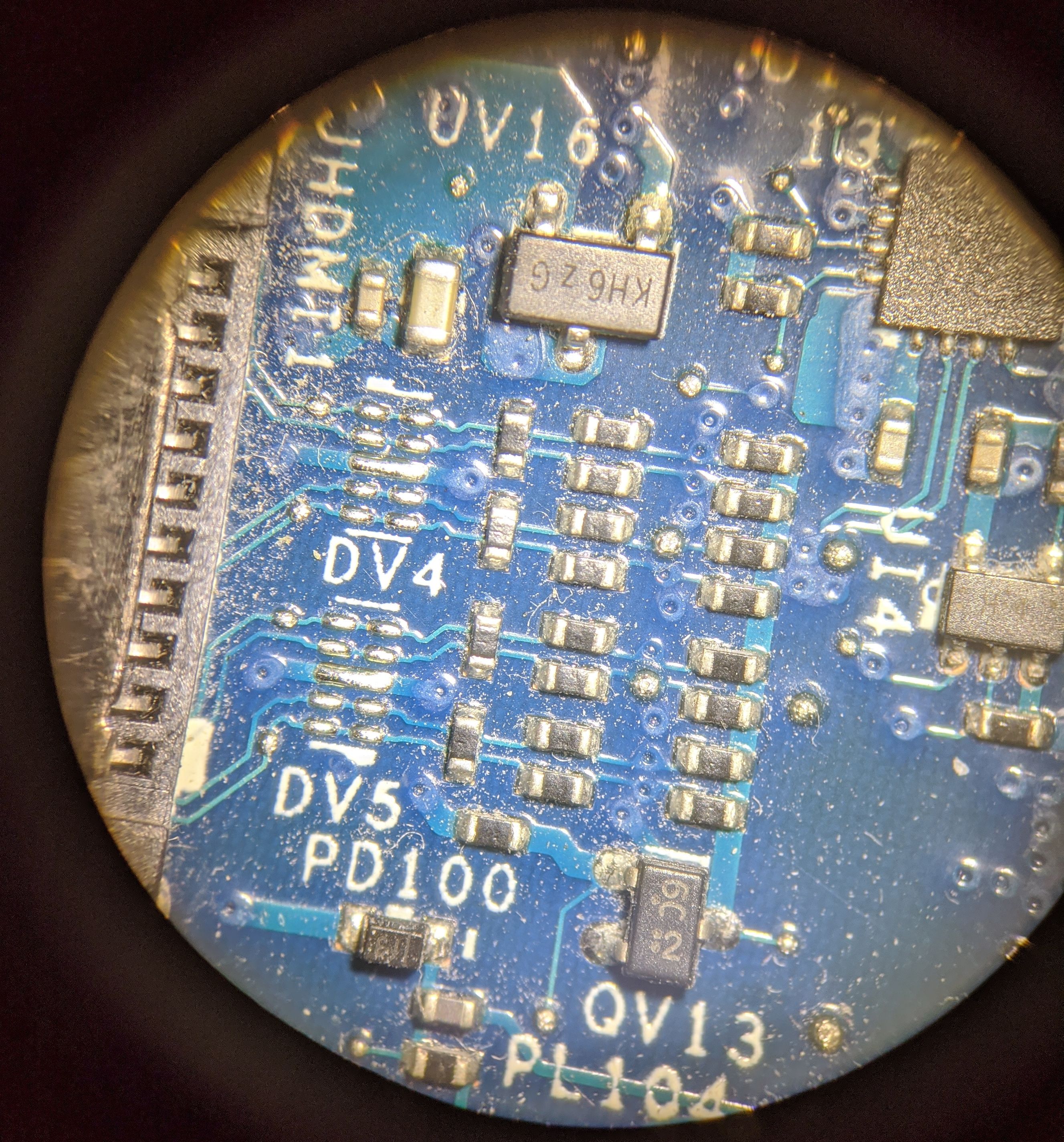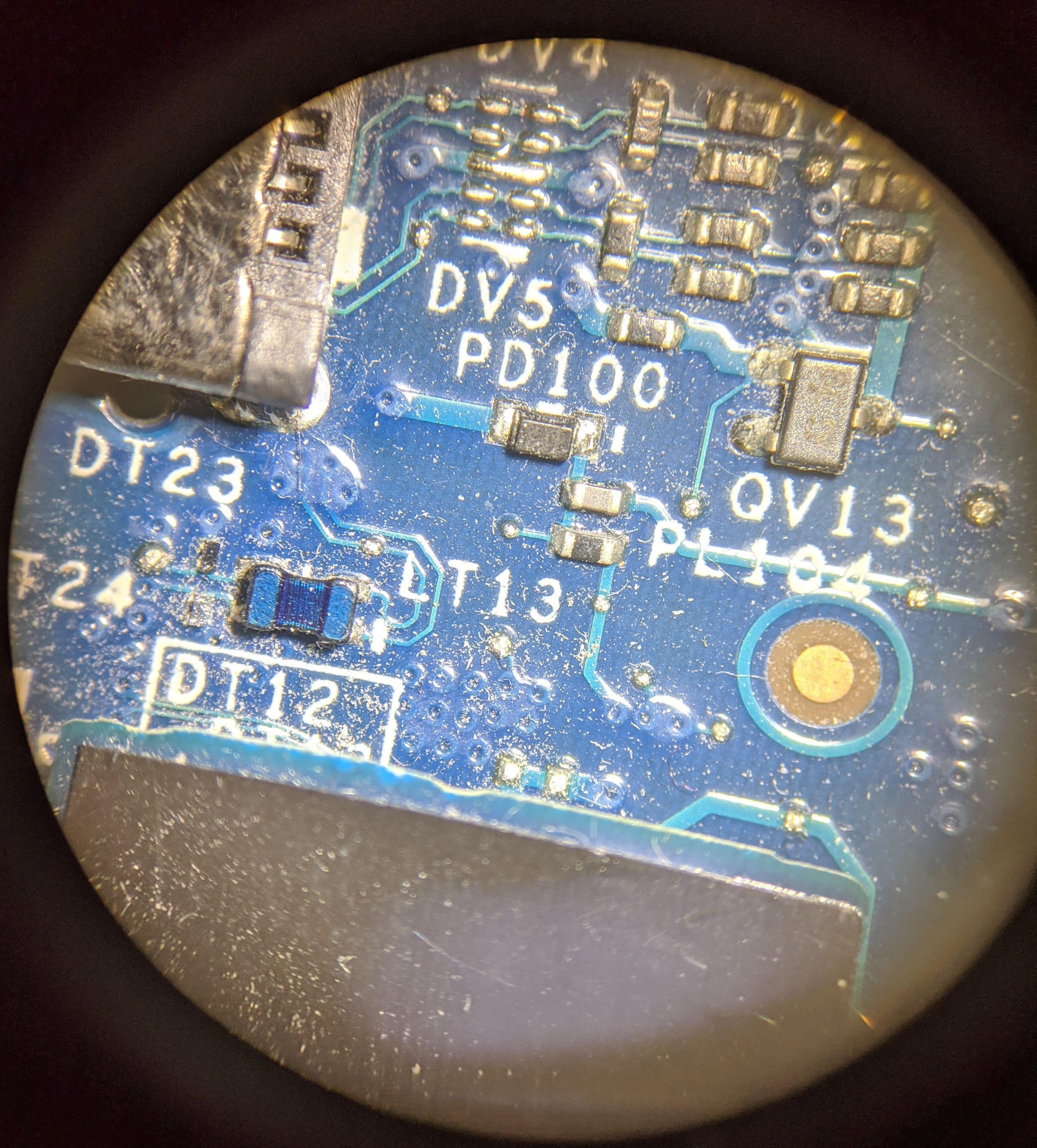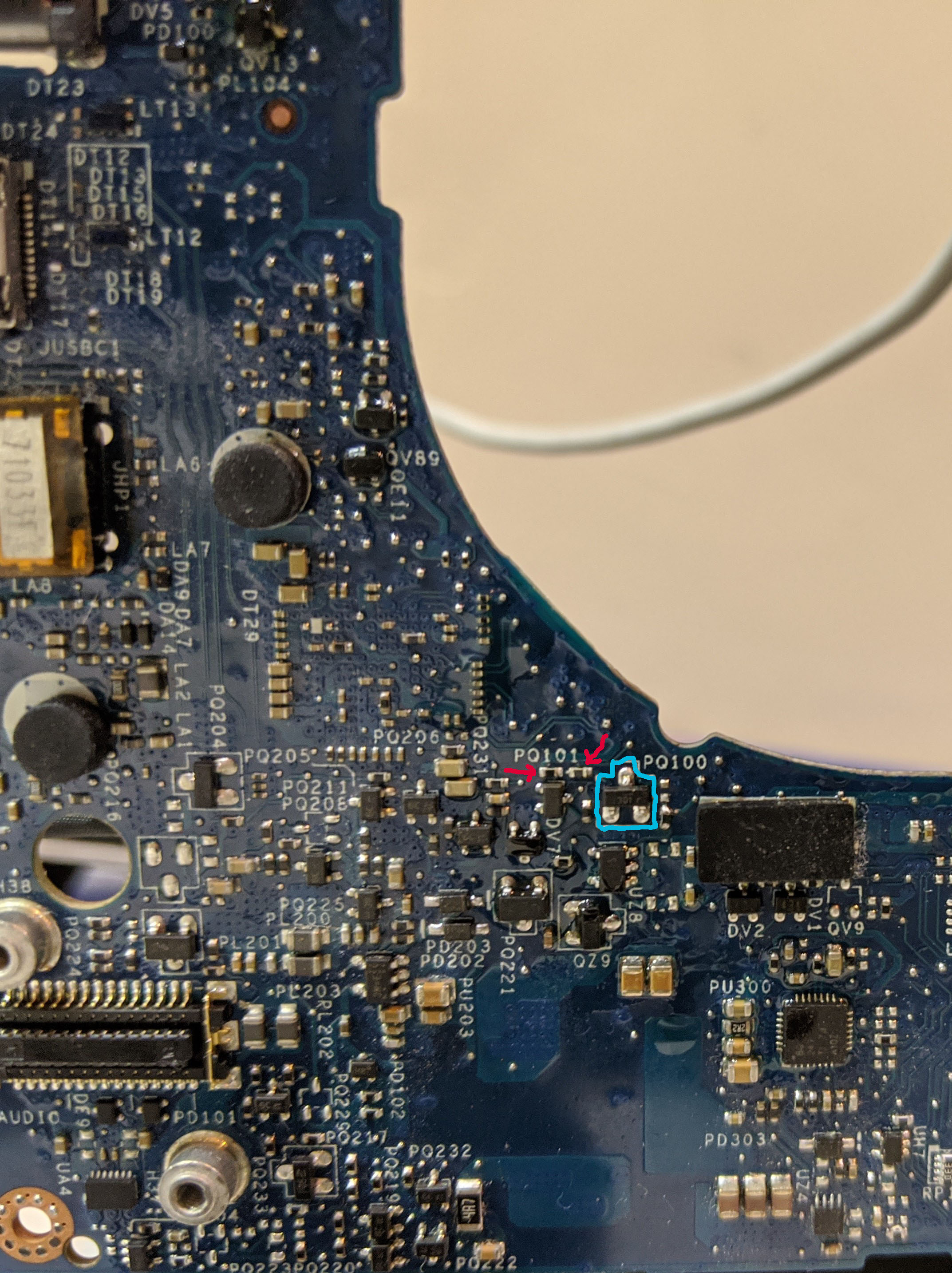 I replaced PQ100 and the two resistors indicated with red arrows with ones from a donor board of the same model that had liquid damage in a different area.