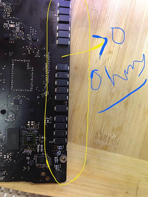 by StephenI check PPBUS_AON and there is a short present on the line, the computer shows a short when testing for short to ground, so when I inject voltage into the line, I get 0AMPS so no short is showing up. I have replaced a blown cap on this board that exploded and tested for the short and it is now removed. Any suggestions? I tested voltage at the line when the fuses are connected and I am getting 1.2 Volts at the line.