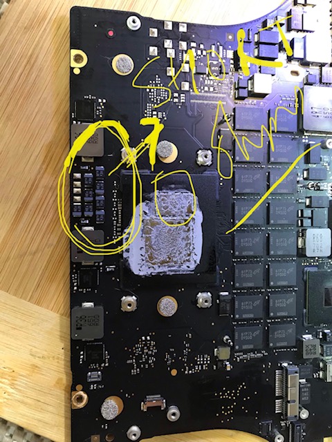 Seriously the meter reading across all the caps you see in marked on the photos shows 0 ohms., something is completely short to ground, either its the CPU/GPU or one of the caps, which I am doubtful now since the caps on the CPU SR1ZX too when I take a meter reading it almost 0 ohms. Physically I do not see anything burnt or bursted. Do you think its the CPU/GPU since the tiny caps on it too are show 0 ohms???Comment
