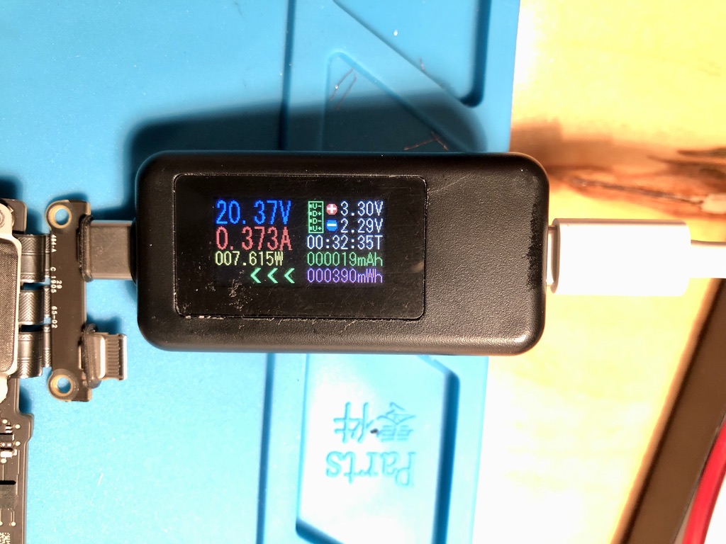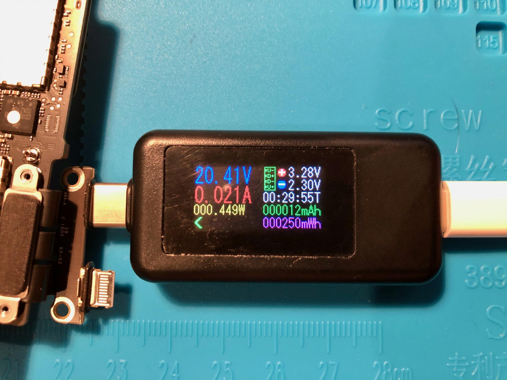 looking at a friend's dead MacBook Pro (A1706). Input voltage 20.41V with a current of 21mA.
