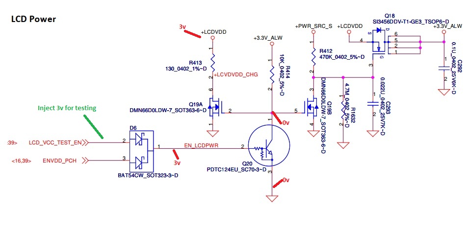 Can anyone tell me what volts I should have on LCD_VCC_TEST_EN and ENVDD_PHC to know when it works properly and if ENVDD_PHC is missing should the chip be changed?
