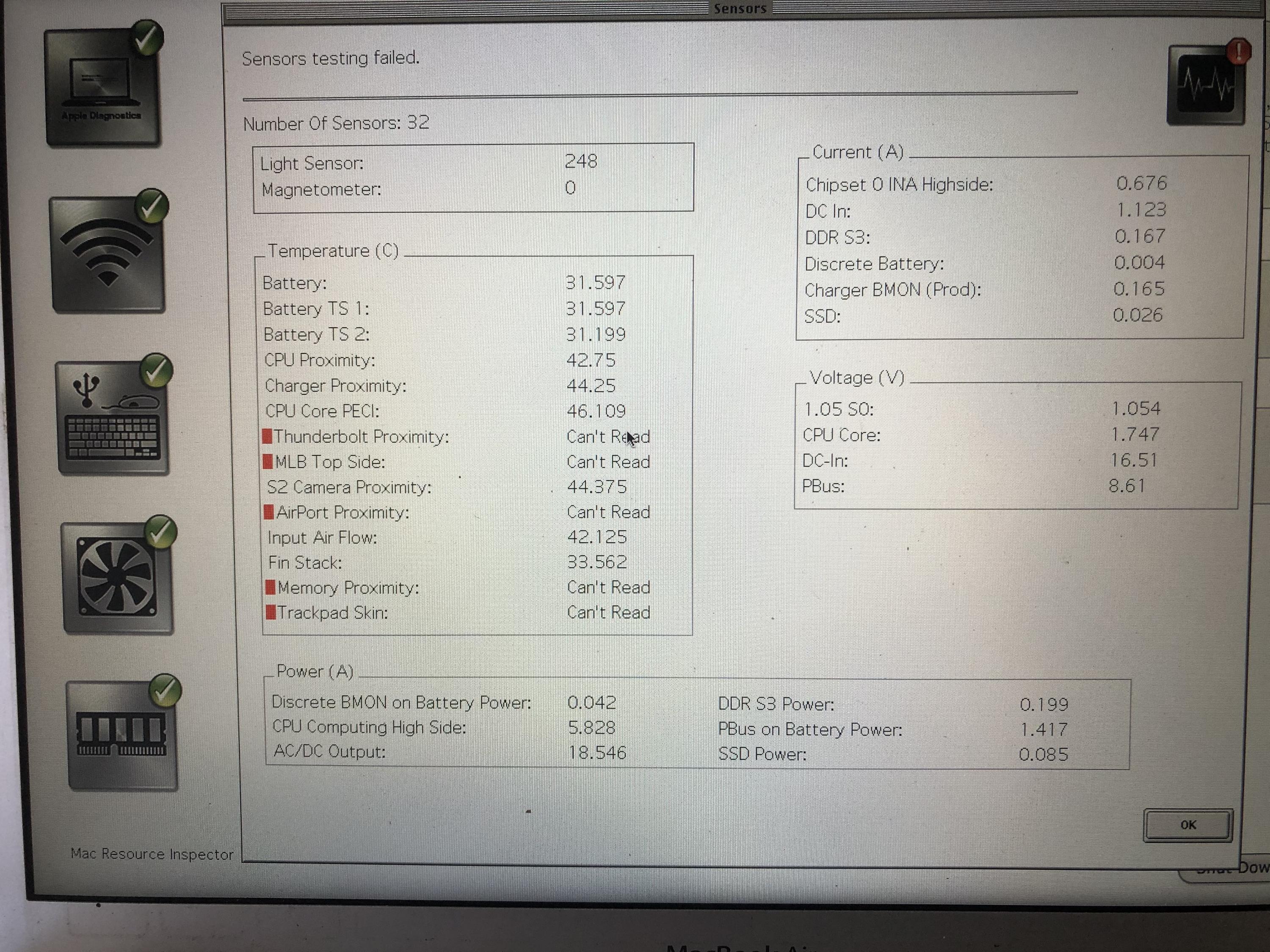 I working on a MacBook Air 13 2014 820-3437 with the following error Thunderbolt Proximity, MLB Top Side, Airport Proximity, Memory Proximity and Trackpad Skin. I almost replaced all the sensors already and still have the same results. I attached a Photo here.