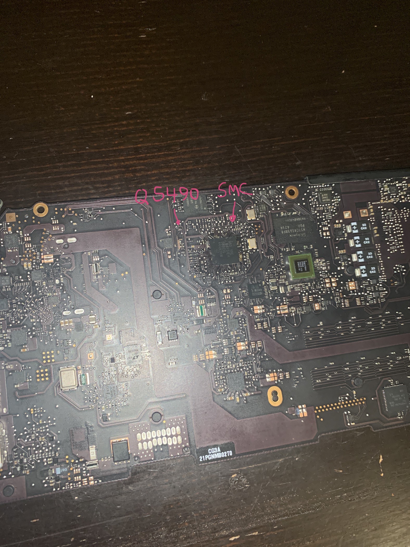 This board likely had work done before. It was probably ultrasonic'd because it's pretty clean. The SMC had its underfill removed so someone probably reflowed or replaced (doubt) it. Pictured: Near the SMC the traces of Q5490 for pins 4 (PPDCIN_G3H_ISOL) and 2 (PP_SLP_SUS_L) are somewhat exposed.