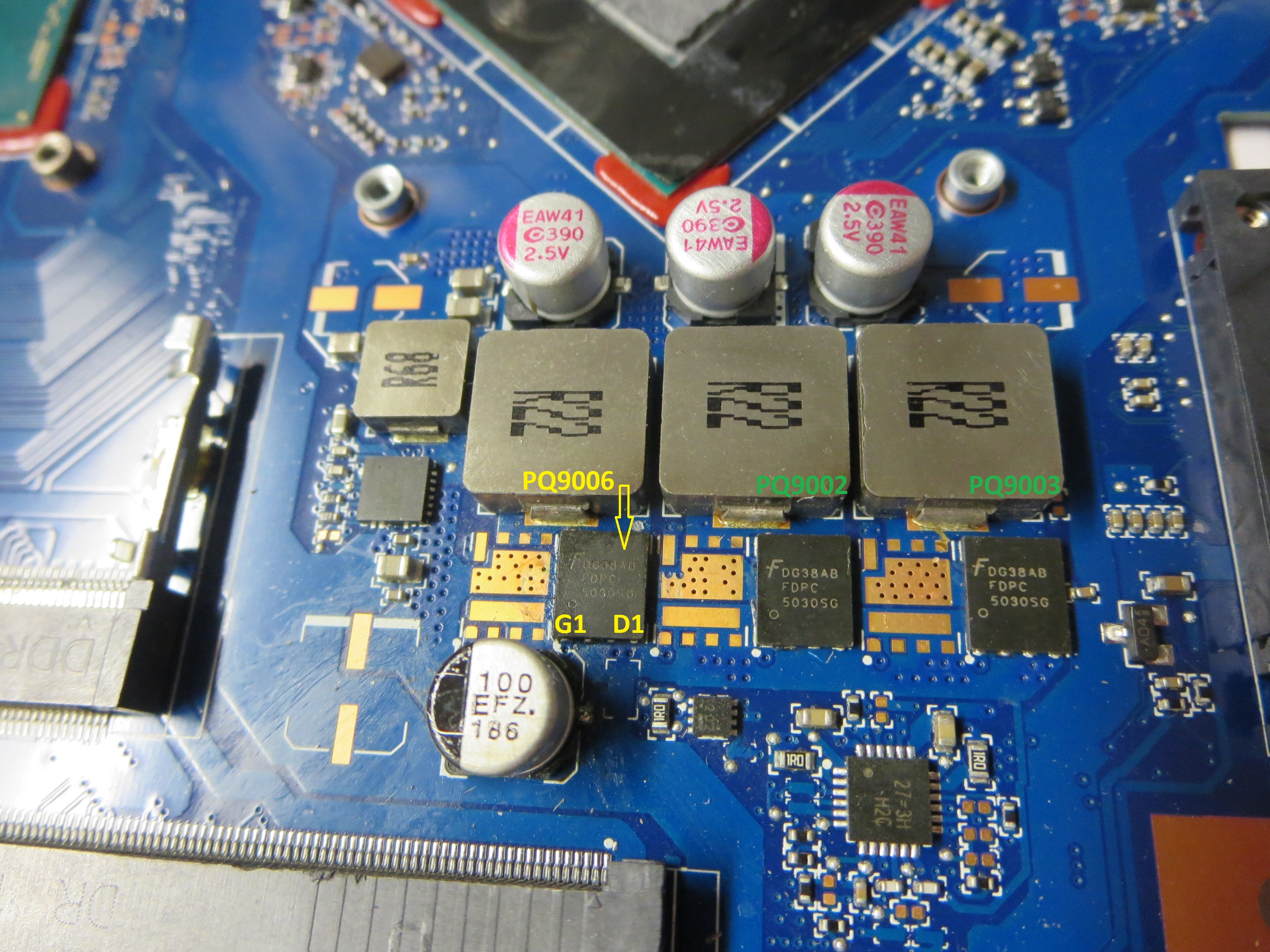 Next, +VAD at drain of 2nd MOSFET (PQ1003) is 19.5V and 0V at source and drain! Resistance of source to ground 16.3 ohms!