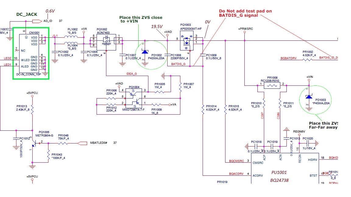 Voltages at PU1001 (BQ24738): ACDET= 2.60V, REGN= 5.95V and VCC=19.0V, CMSRC=0V !