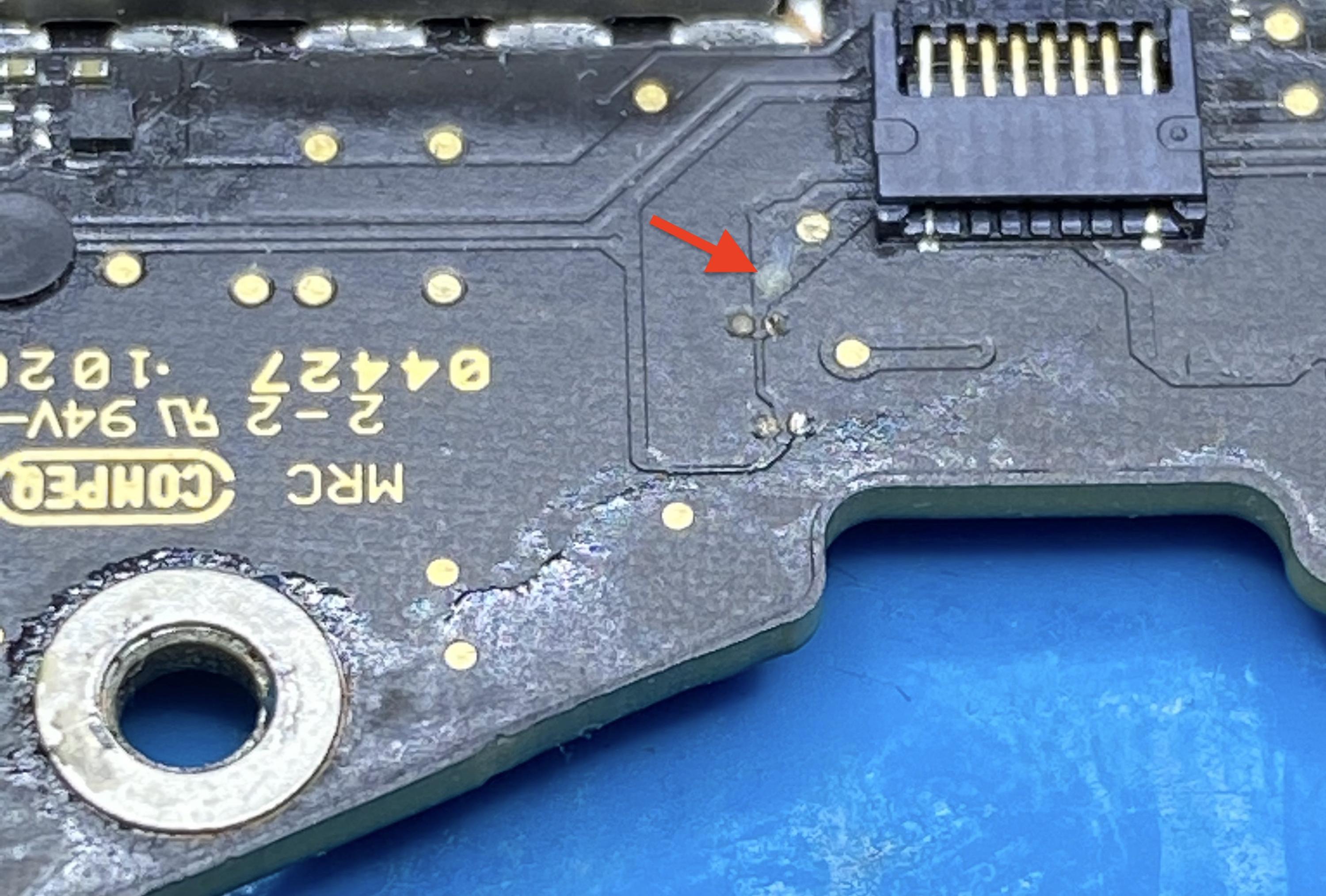 I have a 820-01987-06 Logic board to repair, does anyone know what the testpoint is connected to at the red arrow on the picture ? It is completely destroyed.