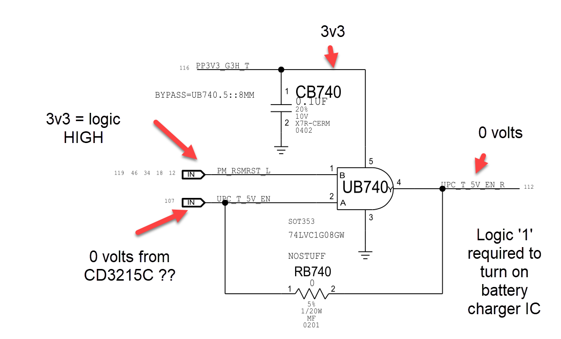 Traced it back to UB740 which is an AND gate and should be '1' @ output to turn ON the battery charger IC # UB700.