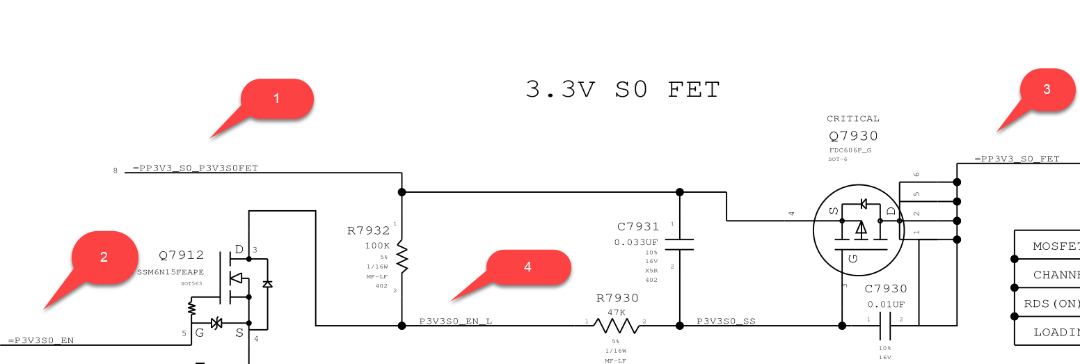Schematics PP3V3_S0 identifies the mosfet Q7930 6 Pin should have 4 legs 1,2,5,6 at 3.3 volts.