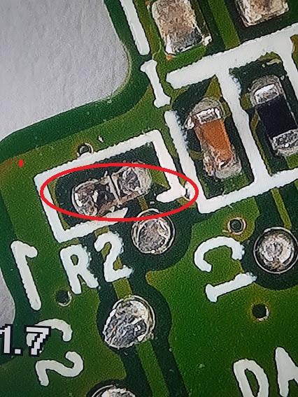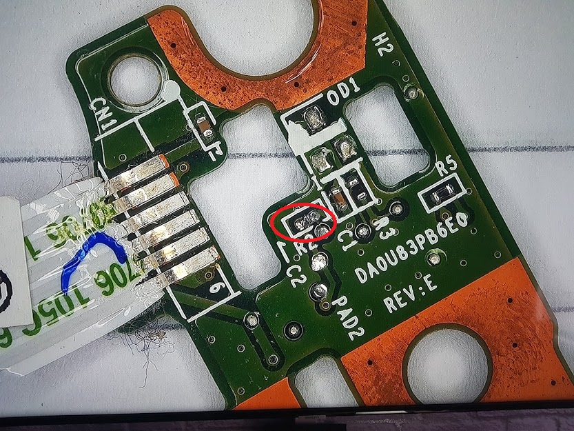 Hi, Guys got this laptop that wouldn't show a display on screen but would do externally . When I checked the power button board which has the screen switch built into it I noticed resistor r2 has a crack right threw the middle of it. To replace the full board they want £15 has anyone any idea the value of this resistor and I will just replace it I tried the schematic for the laptop but it doesn't included the power button board.