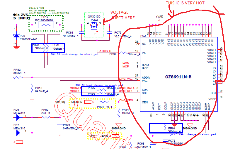 I have here acer e5-411 DA0ZQMMB6H0 REV:H motherboard, the problem is shorted 19v rail , when i tried inject voltage on PQ22 pin 3 PU2 IC is very hot, tried replacing the ic still same issue when injecting voltage very hot, the problem with this is plugging charger then charger lights goes off, anyone can help on this