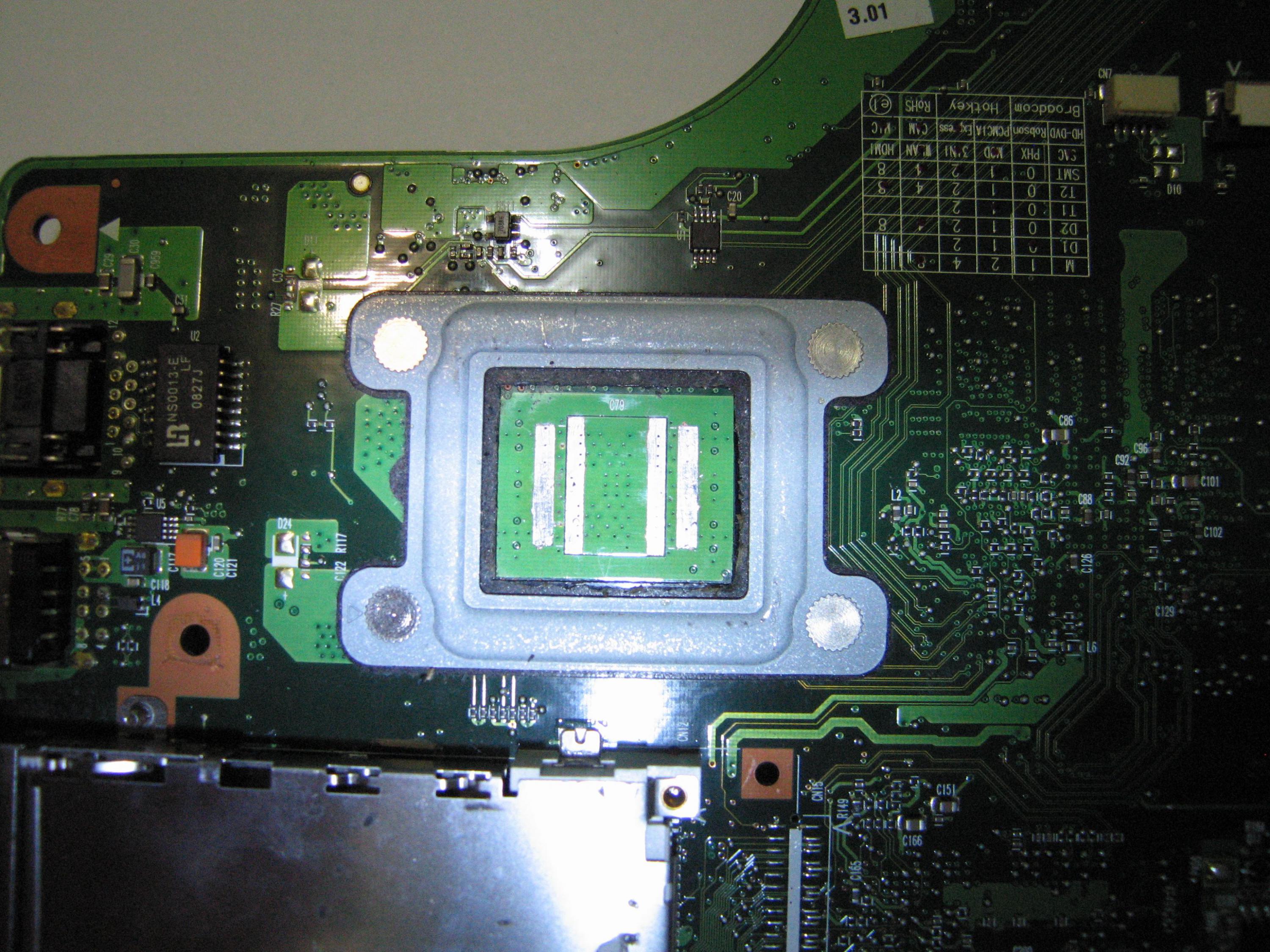 On a related matter, I have a L300 with the freeze problem when on AC power, I opened it and it has a NEC Tokin OE907. I picked up a dead motherboard which supposedly came from a Dell laptop (DA0FM1MB6G3 rev. G) and it contains:
