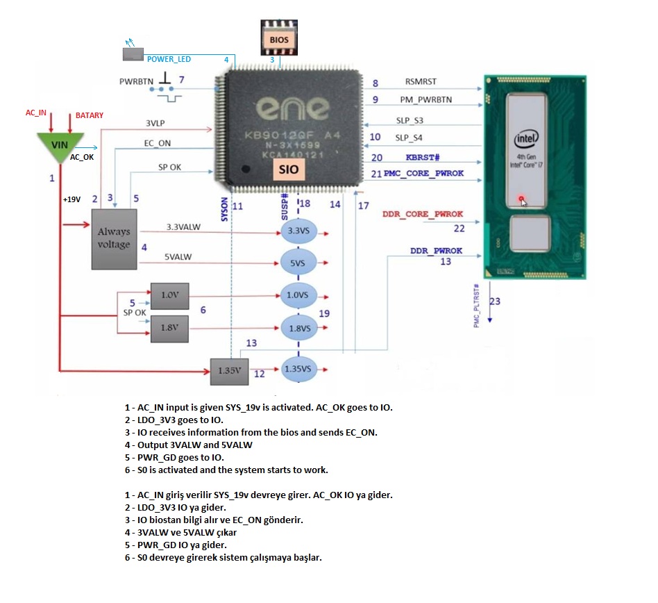 In the scheme, when 3VLDO goes to IO, the power LED and EC_ON signal come to PU2001 with familiar information (AC_OK signal) from bios. ALW voltages are output. follow to steps