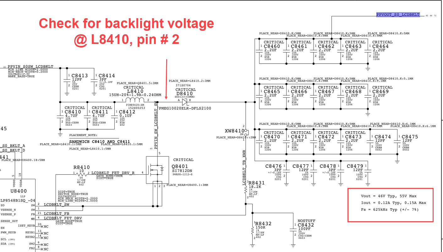 If not known, will try to locate it another way. Once we have the details, using the boardview file viewer, we can locate the backlight voltage rail for your inspection.
