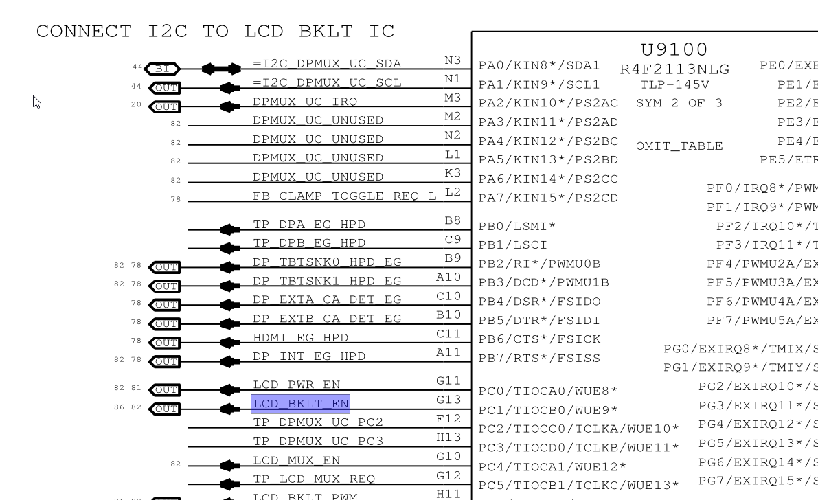 If it helps I previously attempted this: I jumped (LCD_BKLT_EN) to PP3V3_S0 in the U9100 area, and at pin 1 of LCD connector (PPVOUT_S0_LCDBKLT) I got 12.54v.