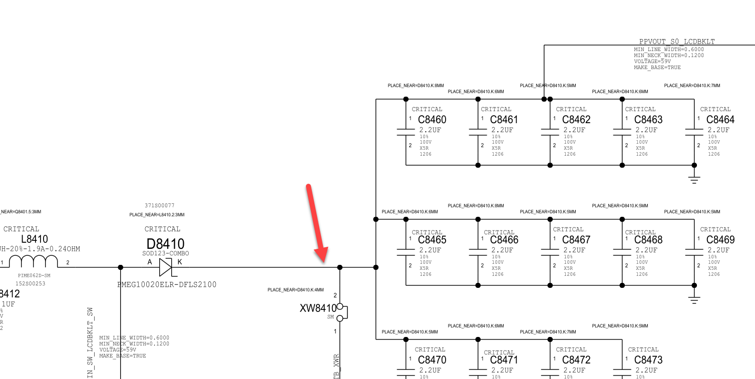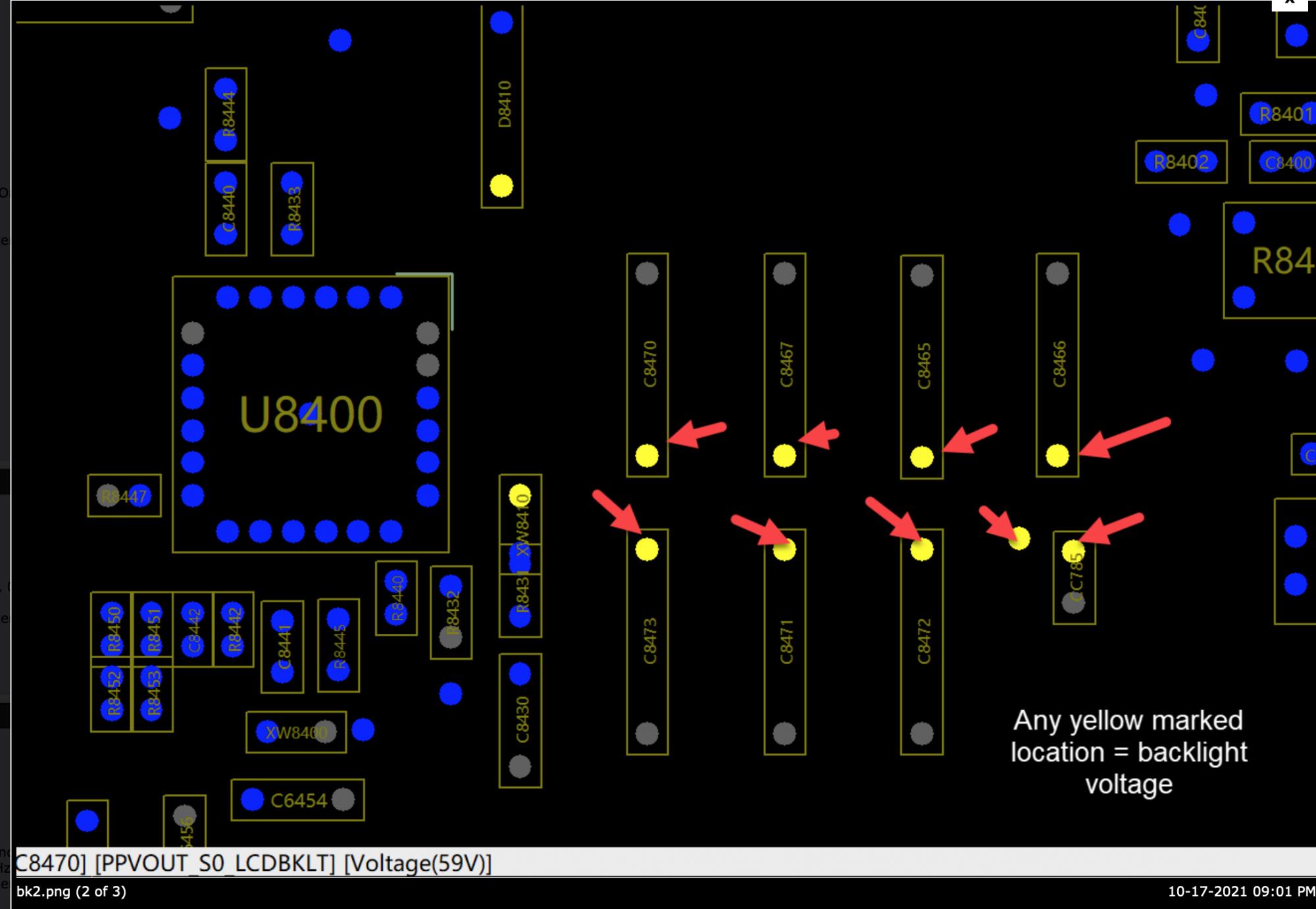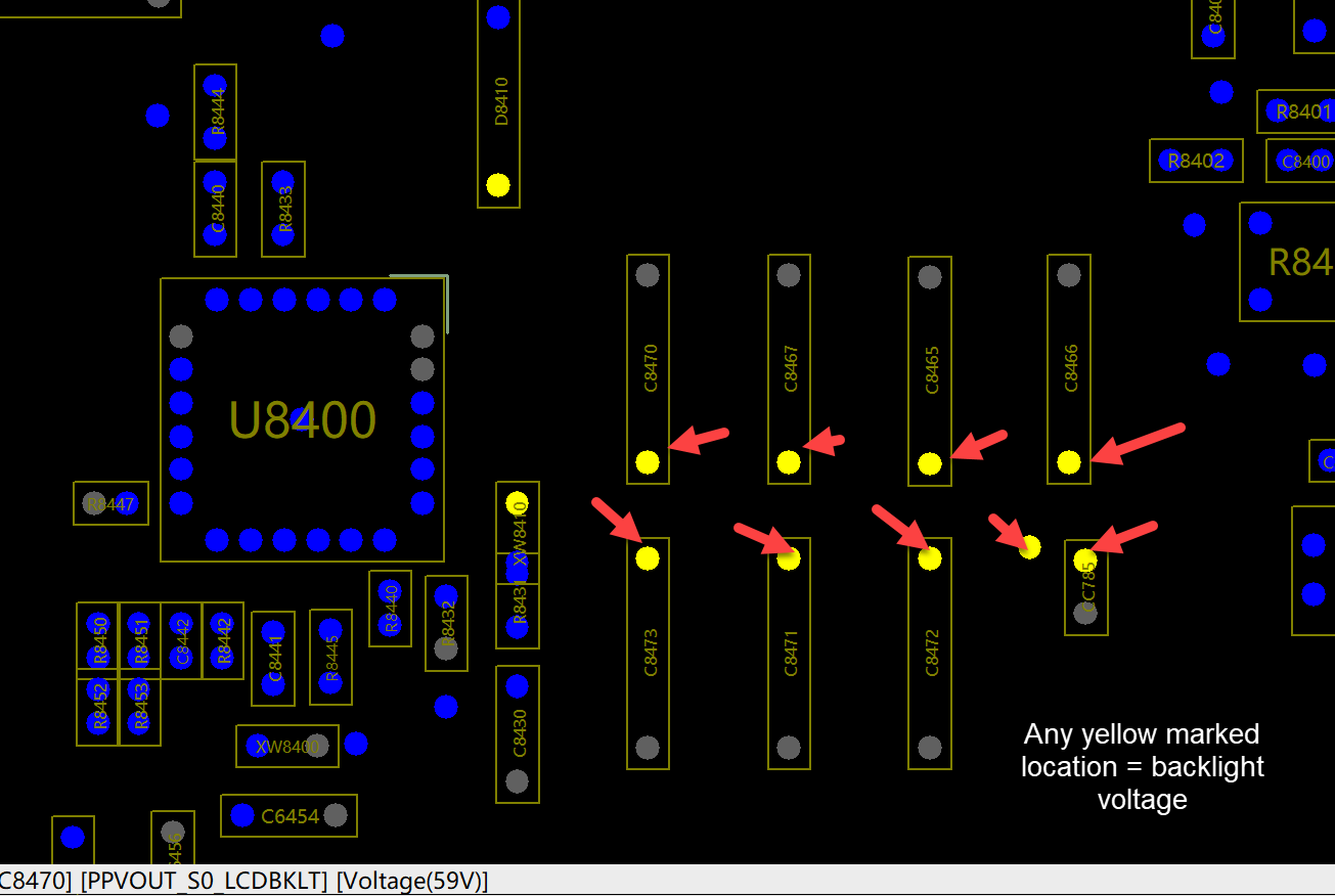 i have a MacBook Pro 15 "2017 820-00281 and everything works. But the display remains dark! I have corrosion on pin 43 and pin 1 of the LVDS connector and that's why I replaced the U9850 and the LVDS cable! But the display remains dark! I have the display tested on the other MacBook, the display is 100% intact. I also installed the OSX on the external monitor. I have just measured F8400. Fuse is ok!